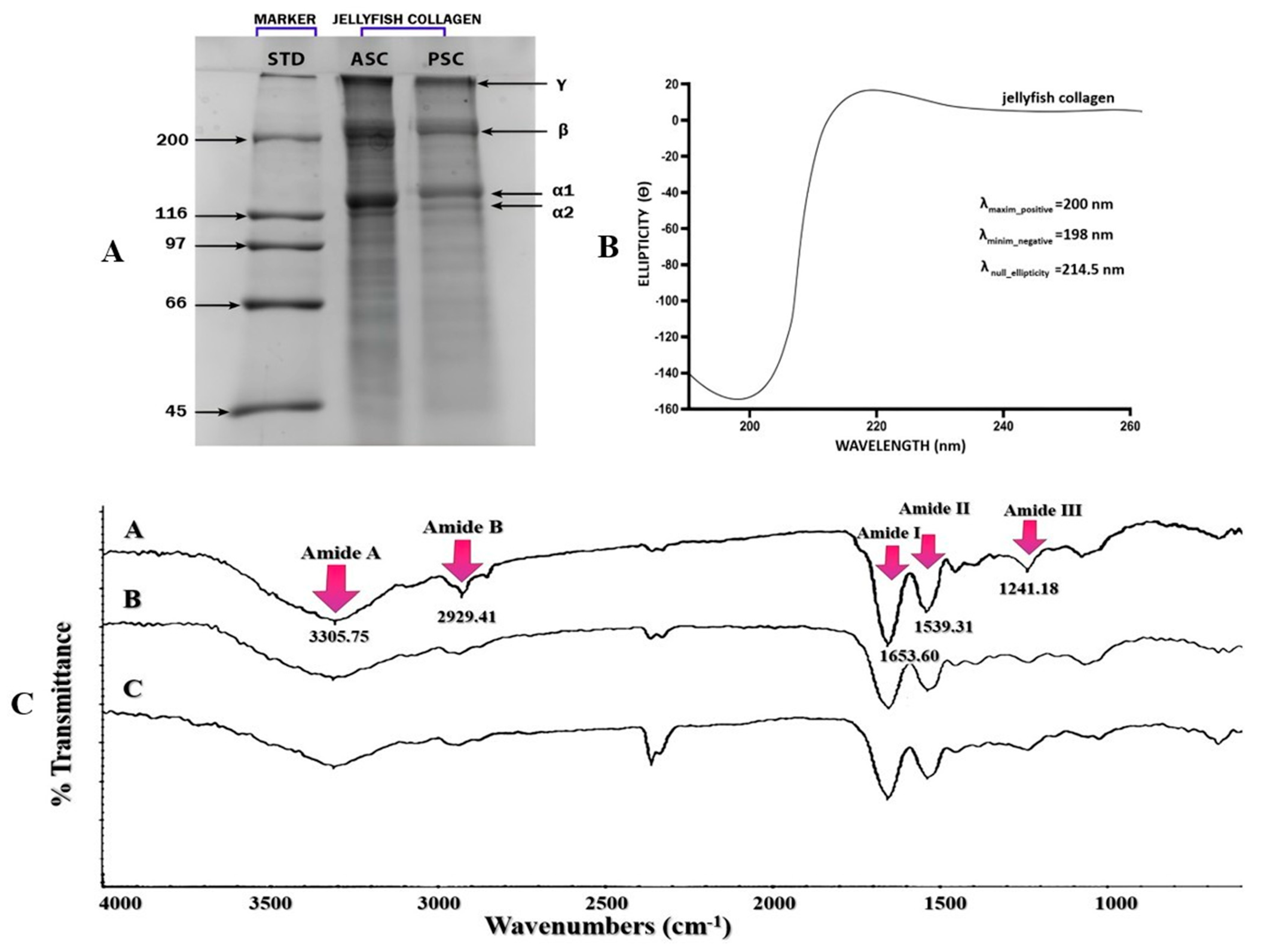 - Barzideh, Z.; Latiff, A.A.; Gan, C.-Y.; Benjakul, S.; Karim, A.A. Isolation and characterisation of collagen from the ribbon jellyfish (Chrysaora sp.). Int. J. Food Sci. Technol. 2014, 49, 1490–1499. [Google Scholar] [CrossRef]
