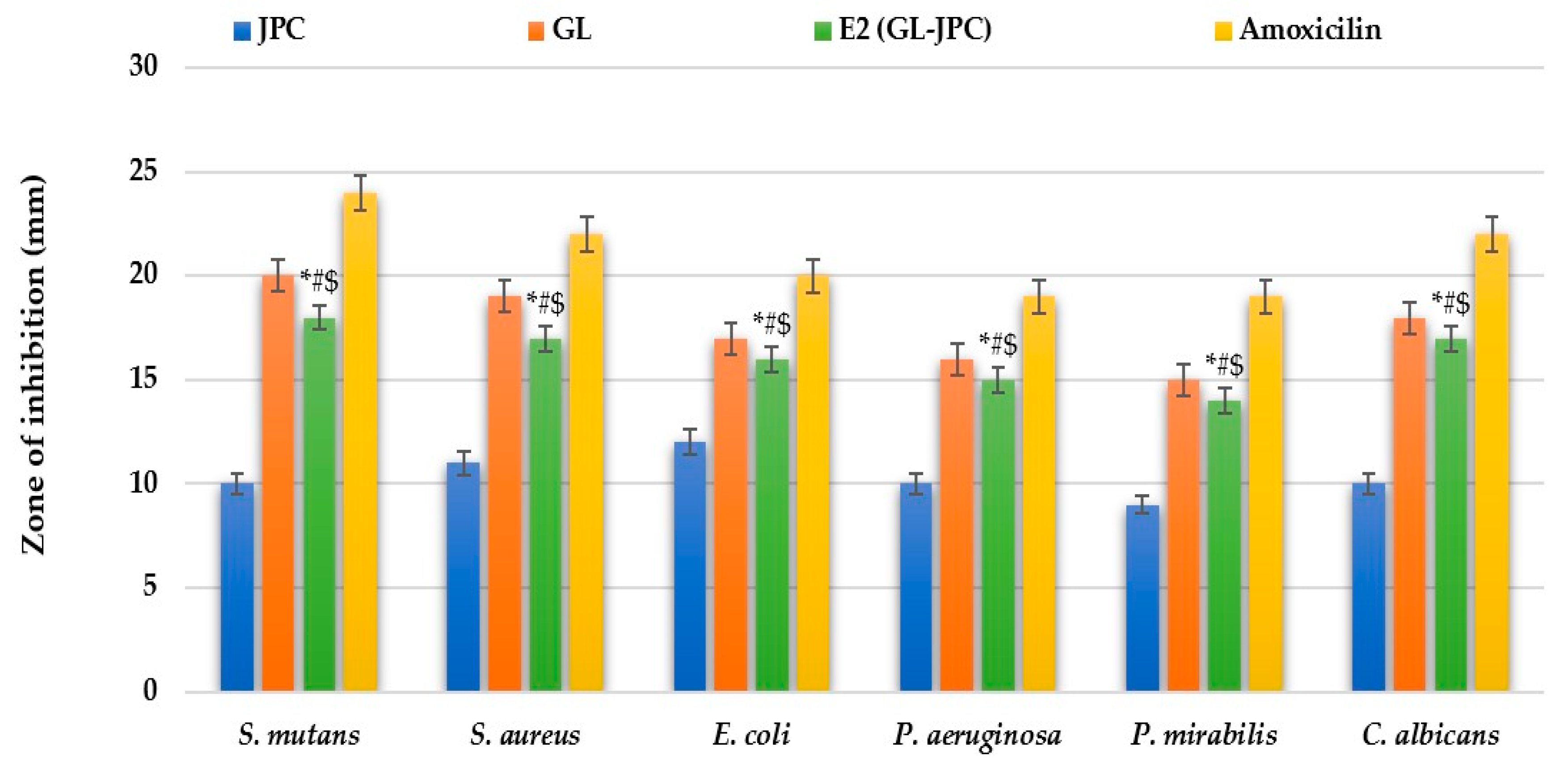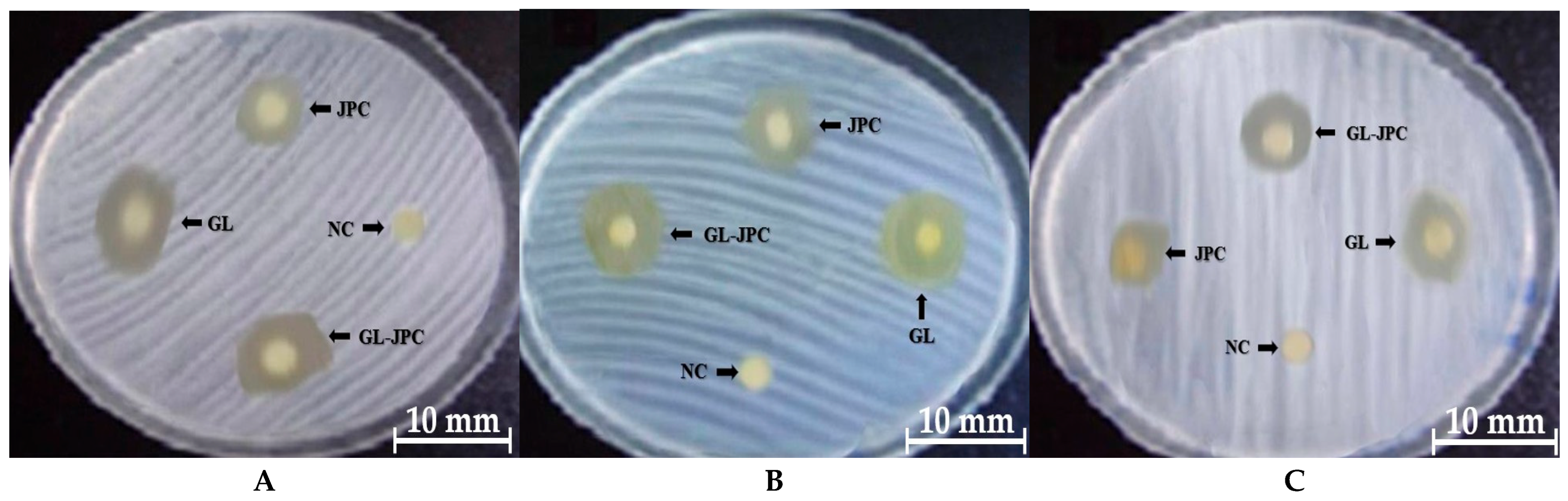 2.9. Biological Evaluation of the New GL-JPC Biocomposite