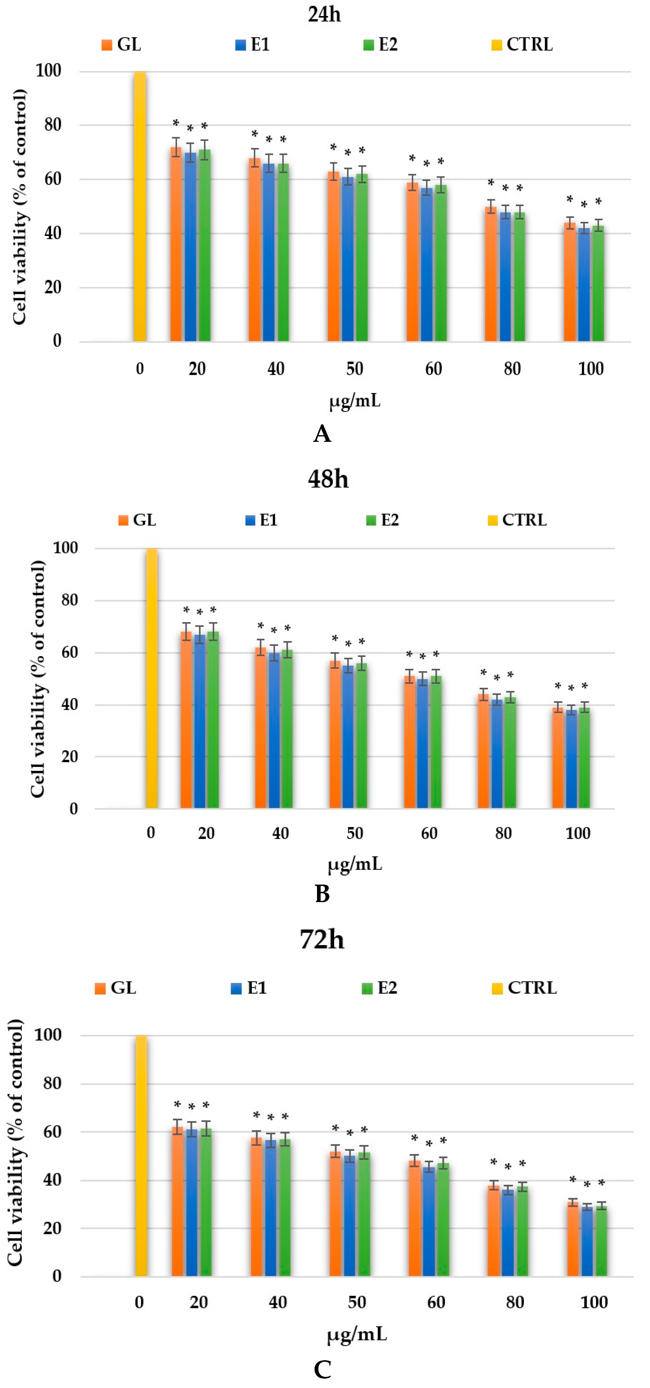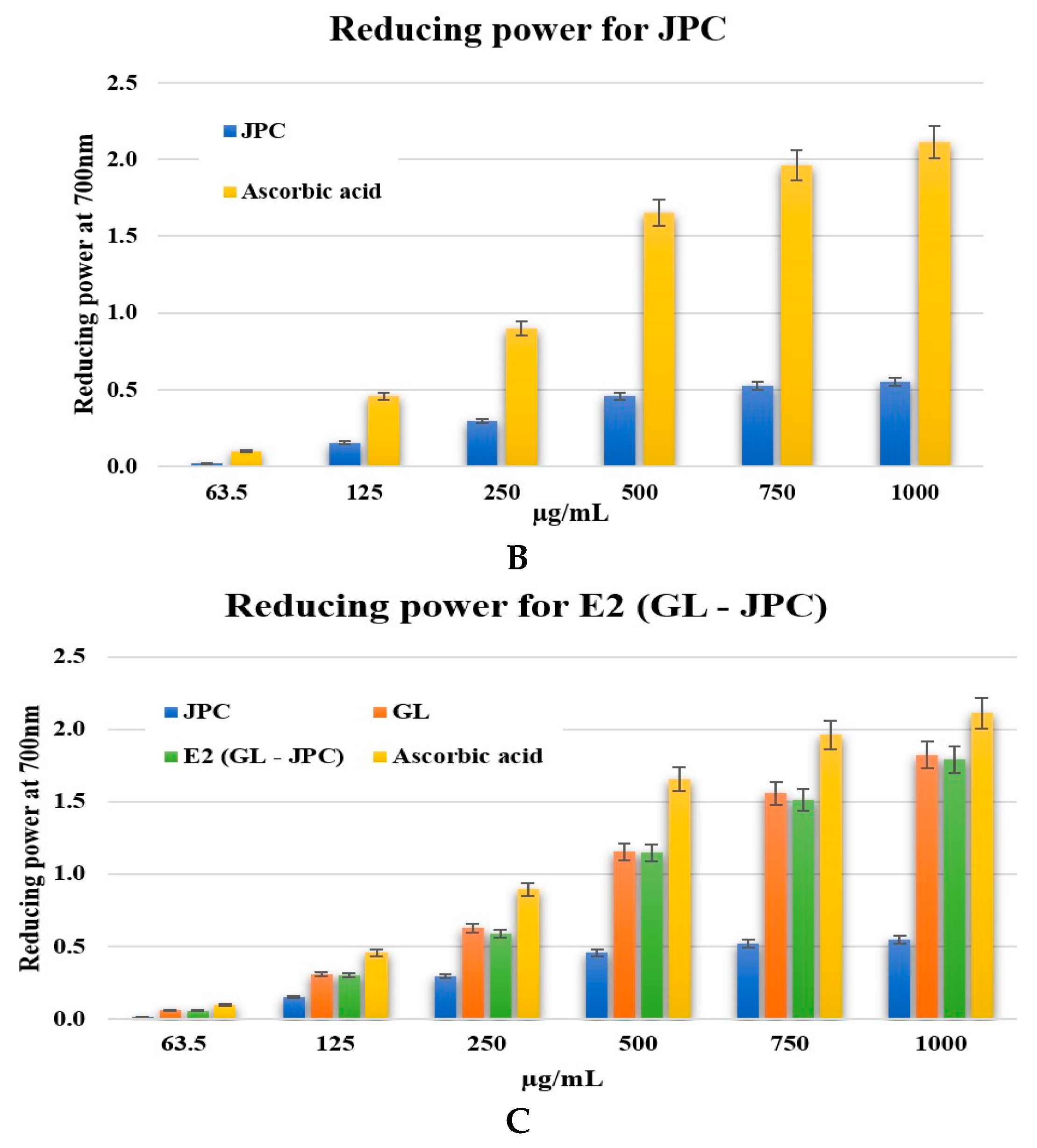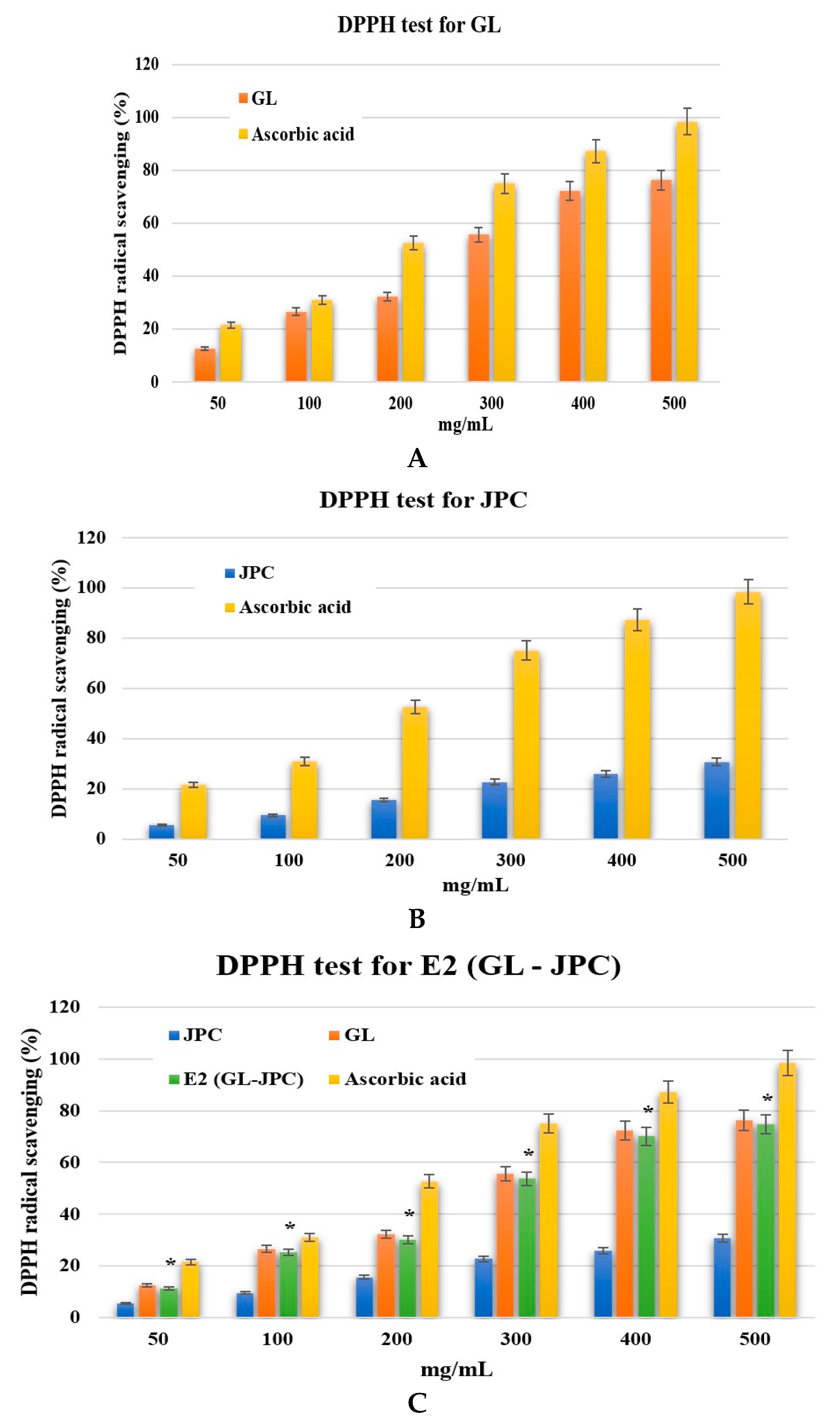 - Extract E2 (GL–JPC): prepared with a composition of 4/5 (v/v) 10% GL ethanolic extract and 1/5 (v/v) JPC collagenic hydrogel extract.