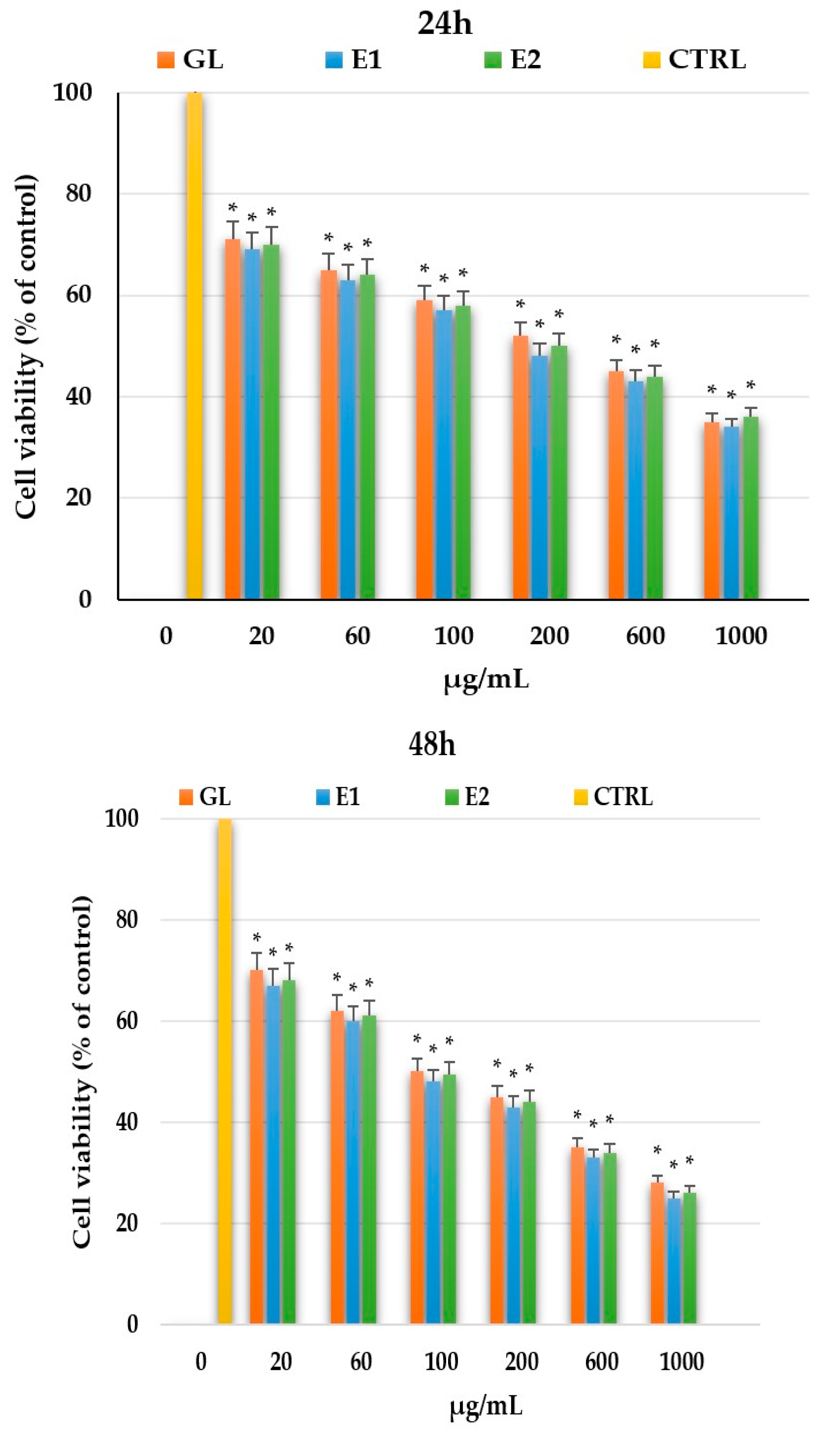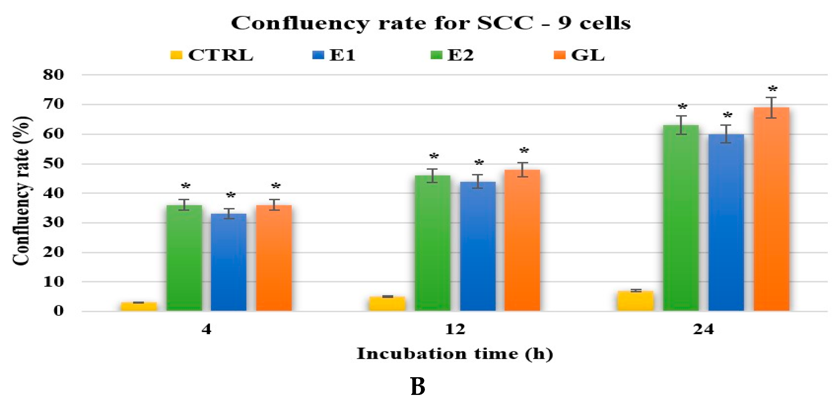 2.9.1. Anticancer Activity on the SCC-9 Lines Cells of New Composite E1 and E2 with GL-JPC