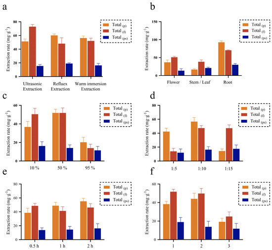 Effect of different factors on the extraction rate of multi-components. (a): Extraction method; (b): Medicinal part; (c): Alcohol concentration; (d): Ratio of feed to liquid; (e): Extraction time; (f): The number of extraction times at a fixed time; Total (p) is the content of total polyphenols; Total (f) is the content of total flavonoids; Total (ps) is the content of total polysaccharides.