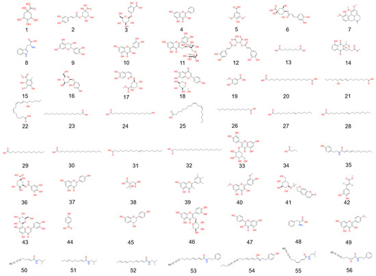 To further identify the active components in APE-EP, high-performance liquid chromatography–mass spectrometry (HPLC-MS) was employed, combined with modern instrumental methods for analyzing the “structure–activity relationship” of the components. A total of 56 active components were identified in APE-EP (Figure 2, Supplementary Figure S2 and Table S10), including 15 flavonoids, 13 organic acids, 13 fatty acids, 8 n-alkylamides, and 2 amino acids, as well as alkaloids, phenylpropanoids, and glycosides. Among these, phenolic acids such as quinic acid (1), chlorogenic acid (6), chicoric acid (12), and vanillic acid (19) are known for their strong antioxidant, anti-inflammatory, and immunomodulatory activities. During the extraction process, phenolic acids were selectively enriched as major components, and the contents of selected phenolic acids were determined to evaluate the anti-inflammatory and immunomodulatory potential of APE-EP. Using caffeic acid as the internal standard, the contents of caffeic acid, chlorogenic acid, and chicoric acid in APE-EP were measured to be 1.54–1.68%, 0.11–0.16%, and 1.99–2.20%, respectively. These levels are higher than those reported for extracts from other parts of E. purpurea. Therefore, the enhanced extraction and purification process thus increased the content of these bioactive compounds [6], suggesting that APE-EP has potential anti-inflammatory and immunomodulatory activities [13,14].
