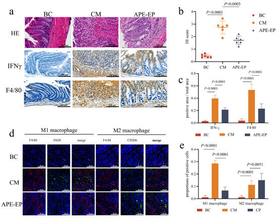 Anti-inflammatory effect of APE-EP. ((a): H&E staining and immunohistochemistry; (b): HI score of H&E staining; (c): Positive area of immunohistochemistry; (d): immunofluorescence; (e): Proportion of different macrophages).