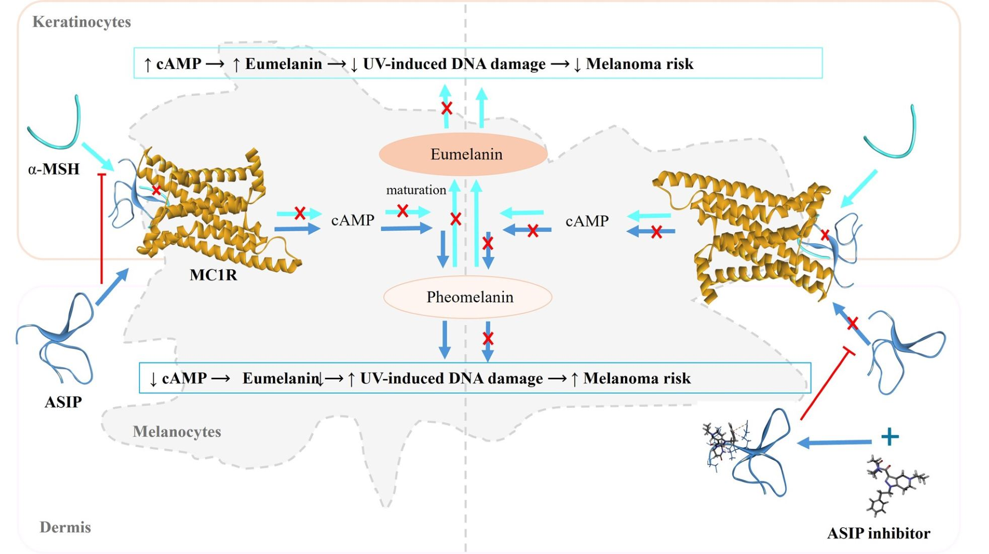 Conversely, when α-MSH is absent or at a very reduced level, ASIP endogenously antagonizes MC1R, diminishing cAMP and tyrosinase activity. This shifts melanogenesis toward pheomelanin, leading to less UV protection and promoting ROS generation and DNA damage, thereby increasing melanoma risk susceptibility [