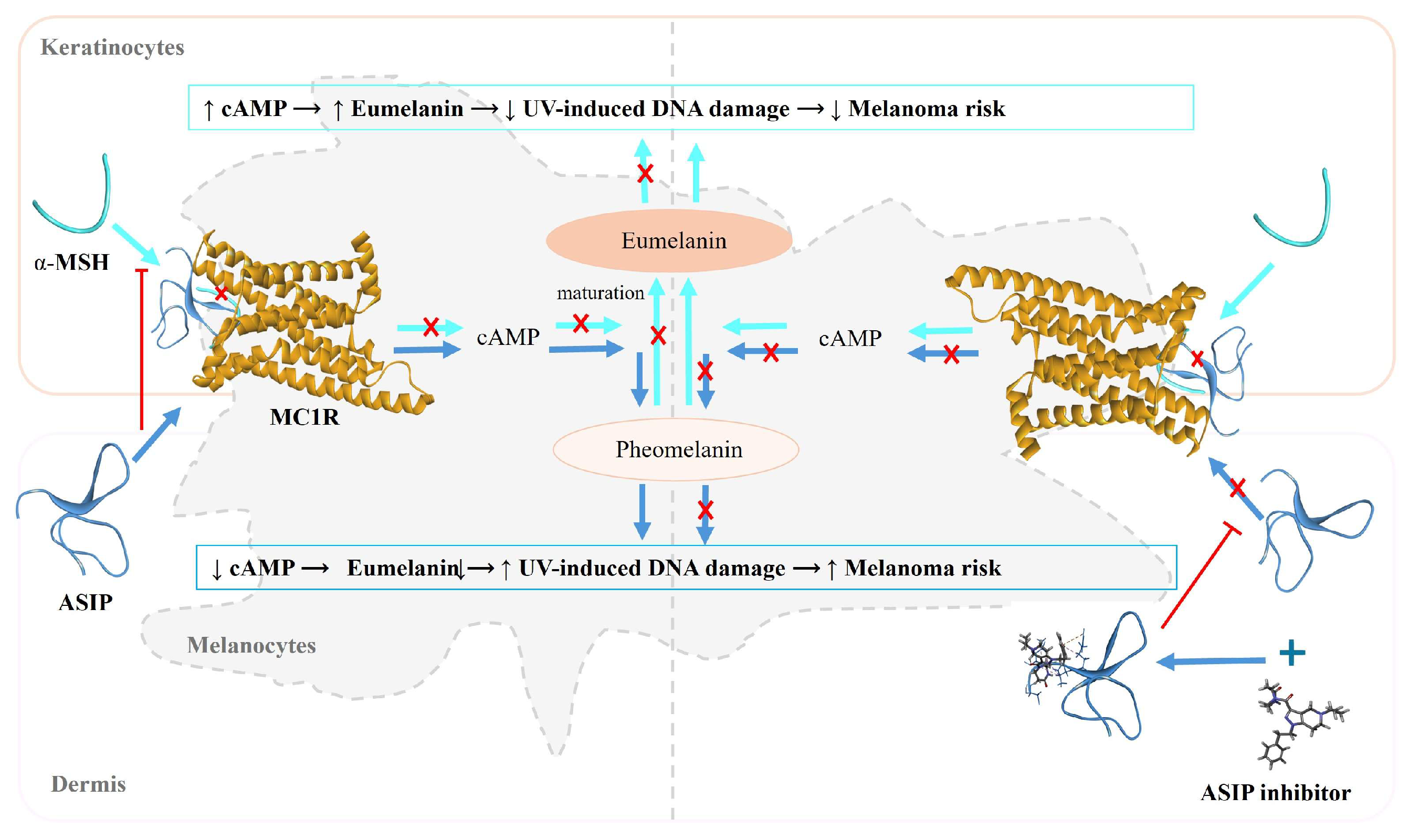 14]. As an endogenous antagonist and inverse agonist of MC1R, ASIP suppresses MC1R-mediated cAMP responses in human melanocytes and thereby governs the eumelanin–pheomelanin switch at the receptor–ligand interface.