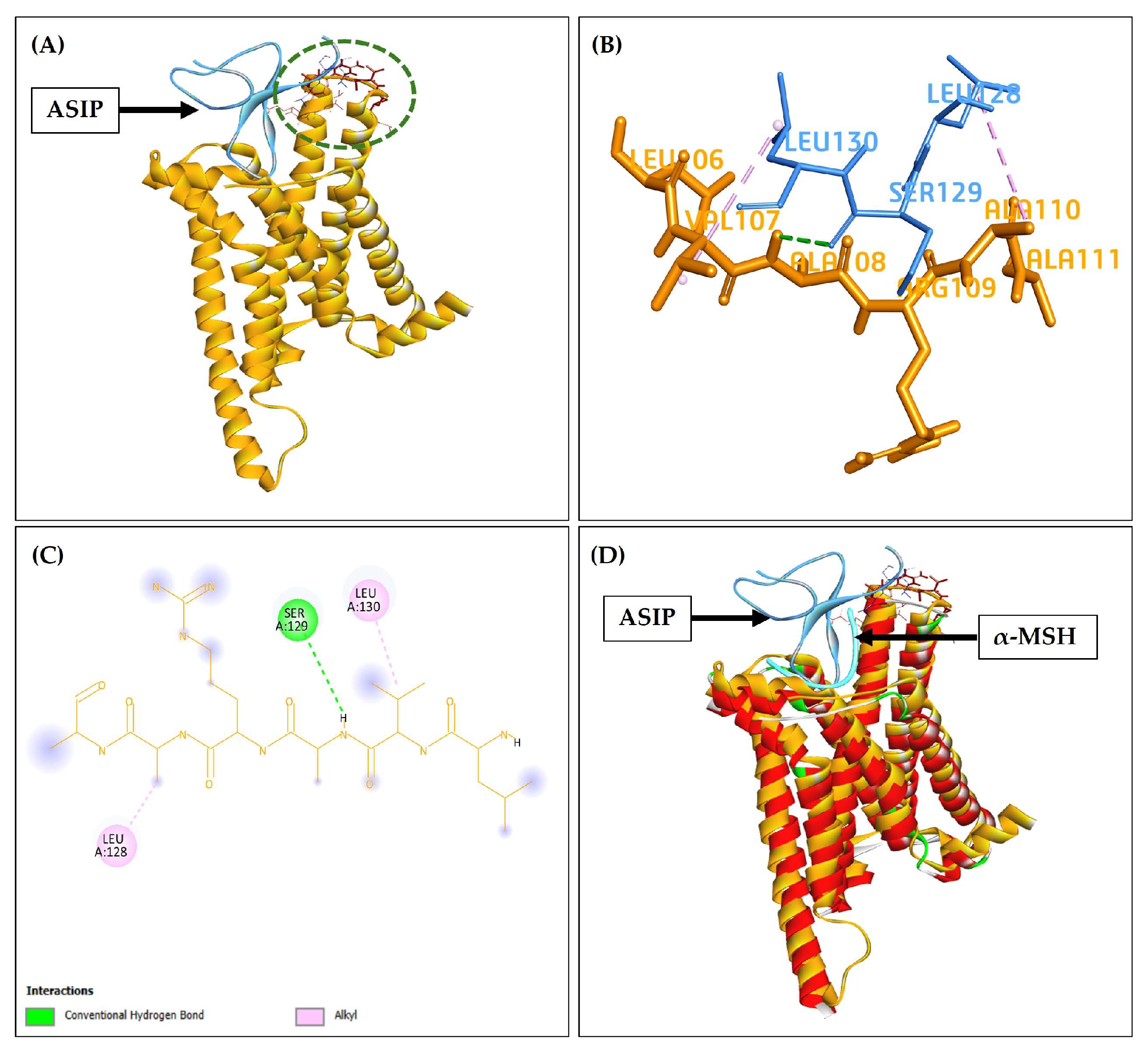 Figure 2A, suggesting a conserved mode of binding. The ZDOCK score was 16.7 for the top-ranked pose of ASIP-MC1R. The 3D and 2D interaction interface residues identified for ASIP were Leu128, Ser129, and Leu130, while those for MC1R included Leu106, Val107, Ala108, Arg109, Ala110, and Ala111 (