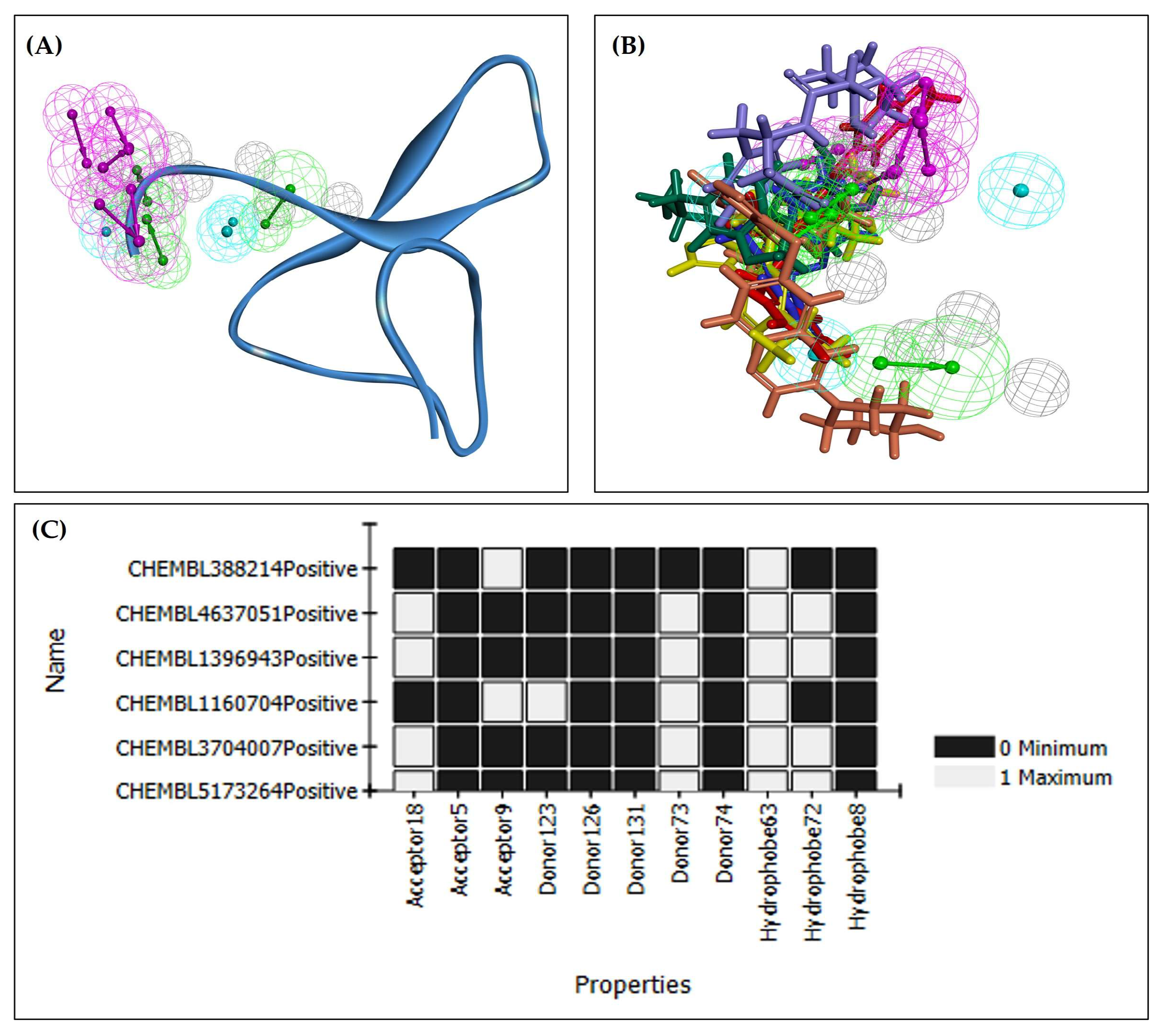 Figure 3C) was generated to visualize which pharmacophore features were preferentially mapped by the active-like ligands. According to Discovery Studio’s mapping protocol, a ligand must satisfy at least four pharmacophore features to be considered a hit. In our model, Hydrophobe63 was defined as a required feature, and at least one feature was required from the VLSLN C-terminal pocket group. For analysis, 11 representative pharmacophore features were selected. All six mapped ligands satisfied at least four of these features, including Hydrophobe63, confirming consistent interaction with the predicted VLSLN binding pocket.