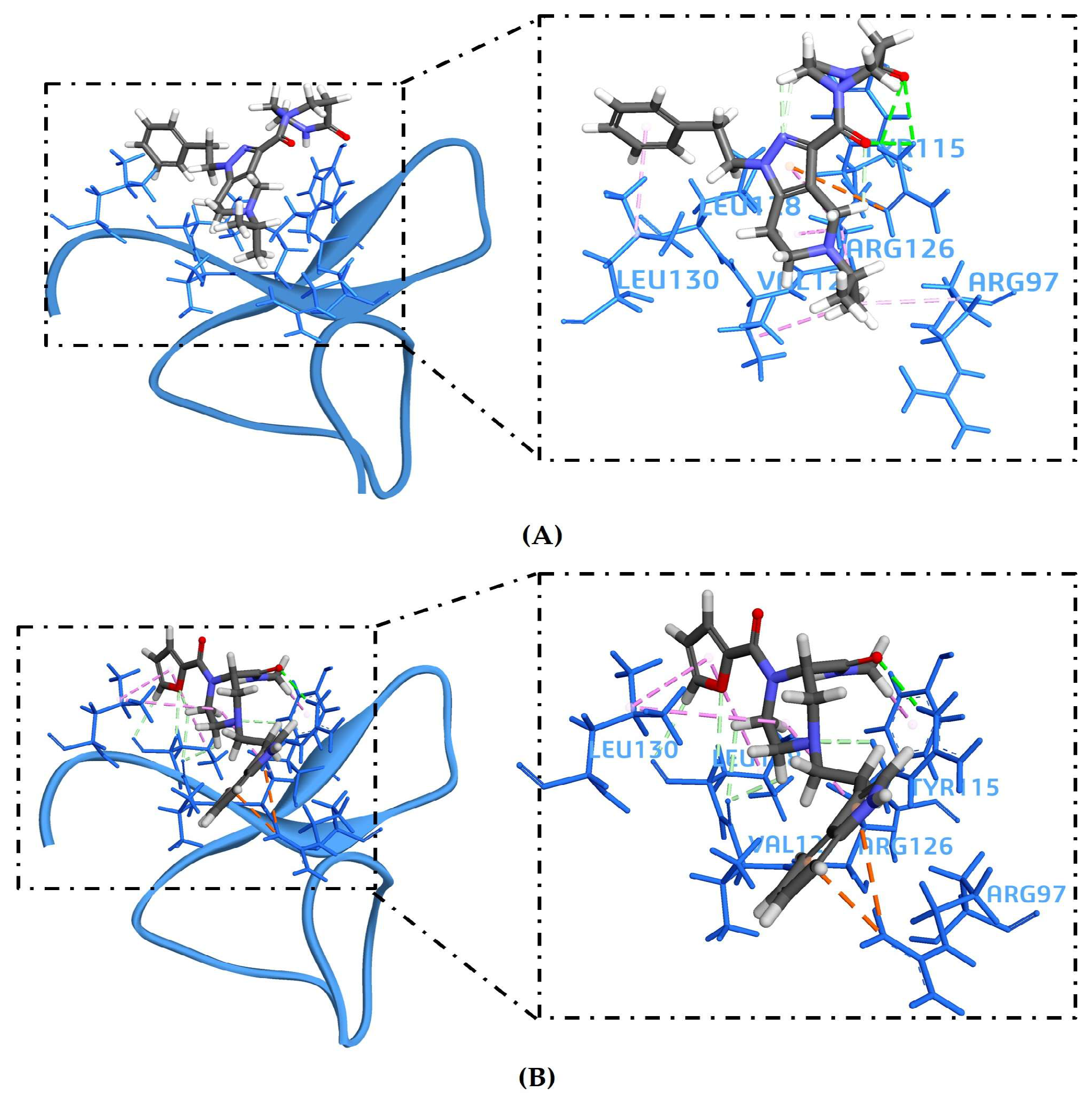 Figure S2). The docked complexes of ligands ZINC14539068 and ZINC24890597 consistently engaged key ASIP residues, including Arg97, Tyr115, Arg126, Ala127, Ser129, and Leu130, and adopted similar spatial orientations (