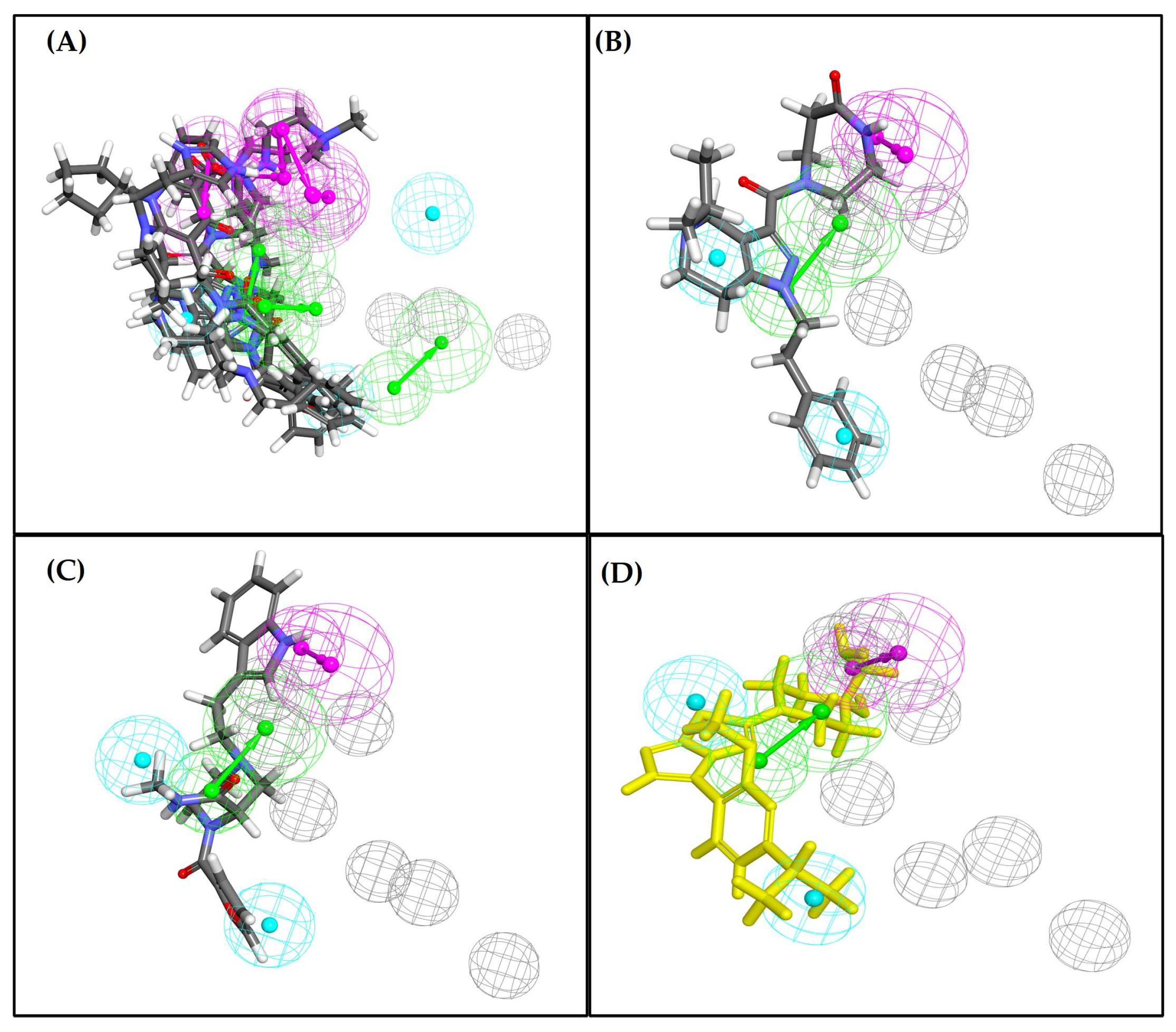 4.7. Superimposition of Docked Ligands on Pharmacophore Features