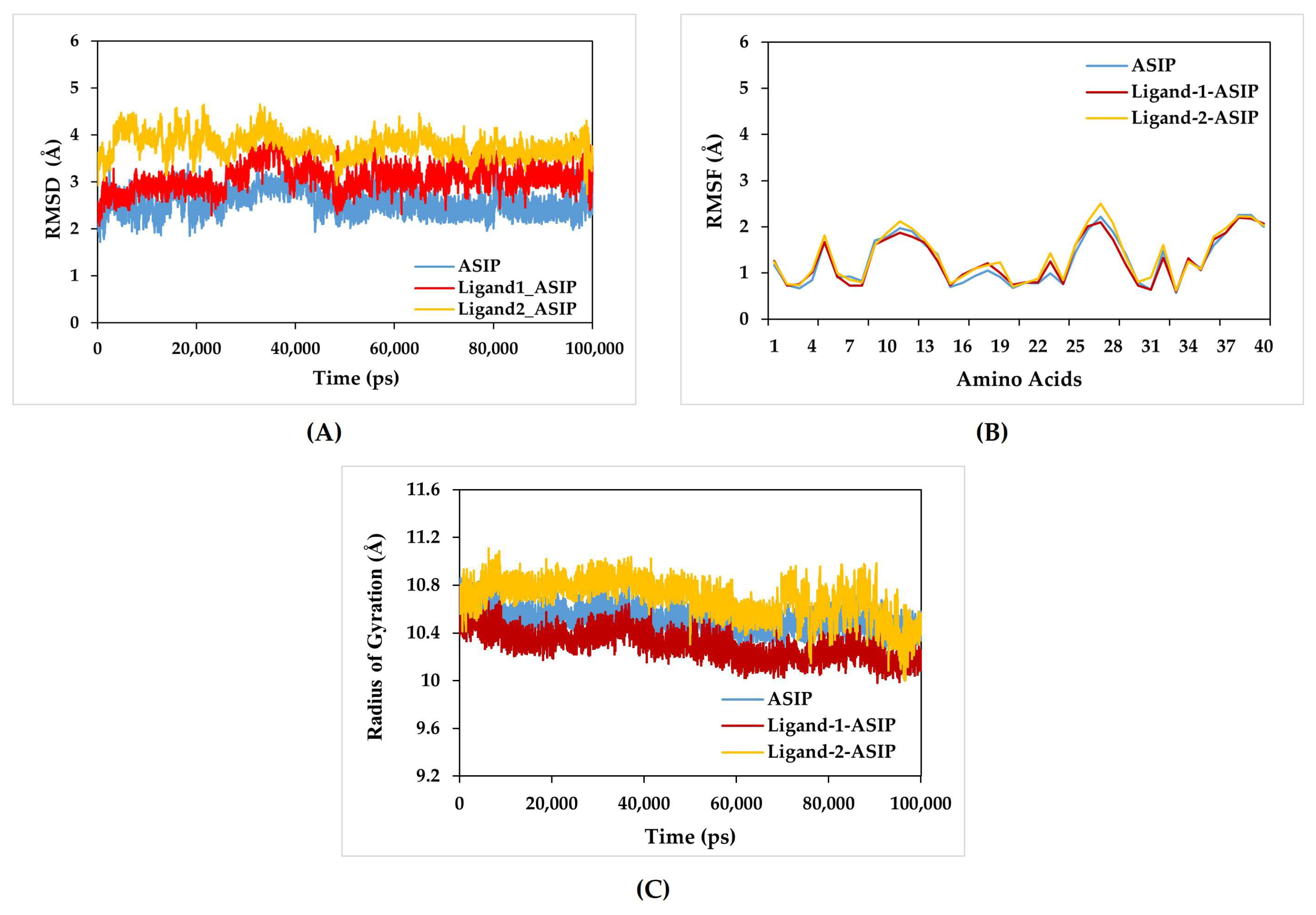 Figure 6B). The RMSF values for the amino acids of the Ligand-1–ASIP complex were close to the RMSF of ASIP but notably lower than the Ligand-2–ASIP complex.