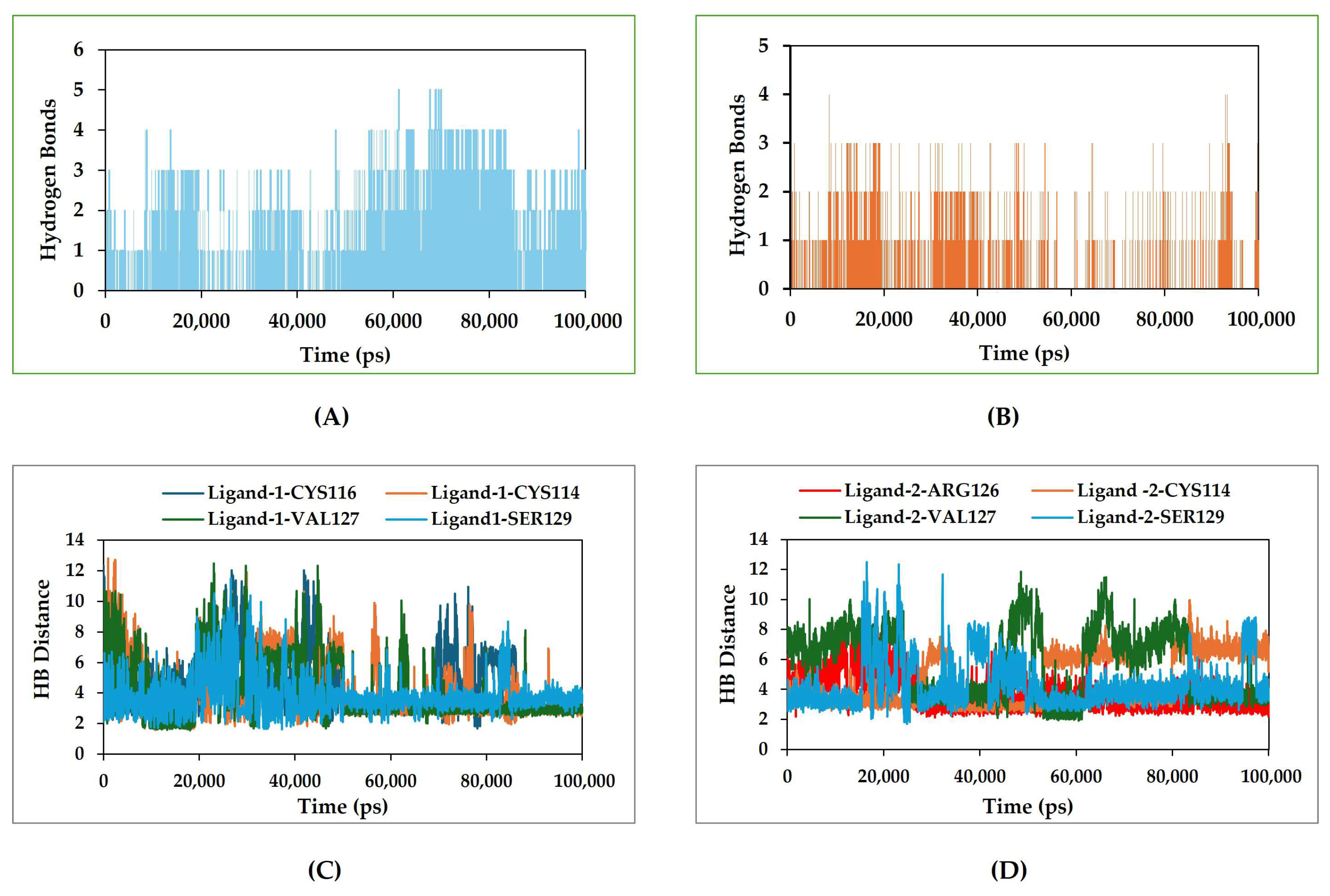 Figure 7D). The interaction of Ligand-2 showed less strong hydrogen bonding, based on the established distance of the hydrogen bond interaction of Ligand-2 with ASIP. The hydrogen bond occupancy percentages between Ligand-1 and ASIP amino acid residues CYS114, CYS116, VAL127 and SER129 were 33%, 42%, 45% and 52%. However, the percent hydrogen bond occupancies between Ligand-2 and ASIP amino acid residues ARG126, CYS116, VAL127, and SER129 were 37%, 25%, 22% and 32%.
