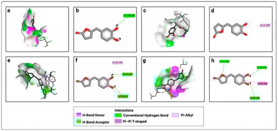 For P1, chrysin forms pi–sigma bonds with amino acids ILE 366, LEU 256, ALA 365, ALA 362, and LYS 266, and pi–alkyl bonds with VAL 415 and ALA 270 (Figure 2a,b). For the second active site (P2), chrysin forms conventional hydrogen bonds with ALA 375 and THR 286, a pi–sigma bond only with VAL 312, and pi–alkyl bonds with VAL 311, VAL 372, and ILE 376 (Figure 2c,d). For the third active site, chrysin forms conventional hydrogen bonds with ALA 1035 and LYS 464, a pi–alkyl bond with VAL 588, and non-covalent pi–pi bonds with PHE 622 and TYR 620 (Figure 2e,f). For the fourth active site, chrysin forms conventional hydrogen bonds with LYS 904, PHE 969, and LYS 948, a pi–cation interaction with LYS 948, a pi–pi bond with PHE 902, and a pi-alkyl bond with PRO 905 (Figure 2g,h).