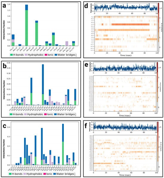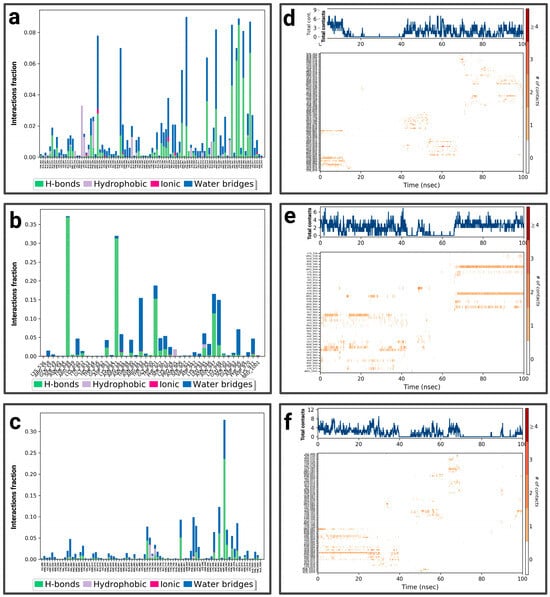 Analysis of molecular dynamics simulation: (a) histogram of P4-EGCg interactions; (b) histogram of P4–chrysin interactions; (c) histogram of P4–luteolin interactions; (d) P4-EGCg contact timeline; (e) P4–chrysin contact timeline; (f) P4–luteolin contact timeline.