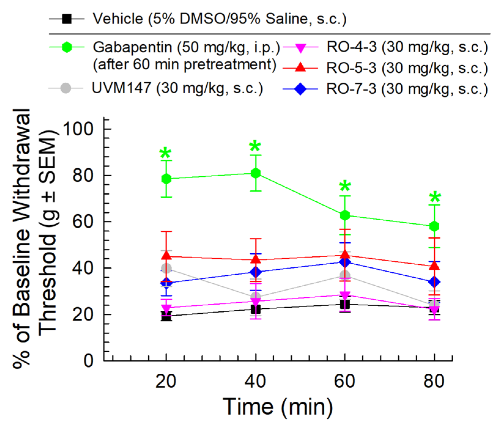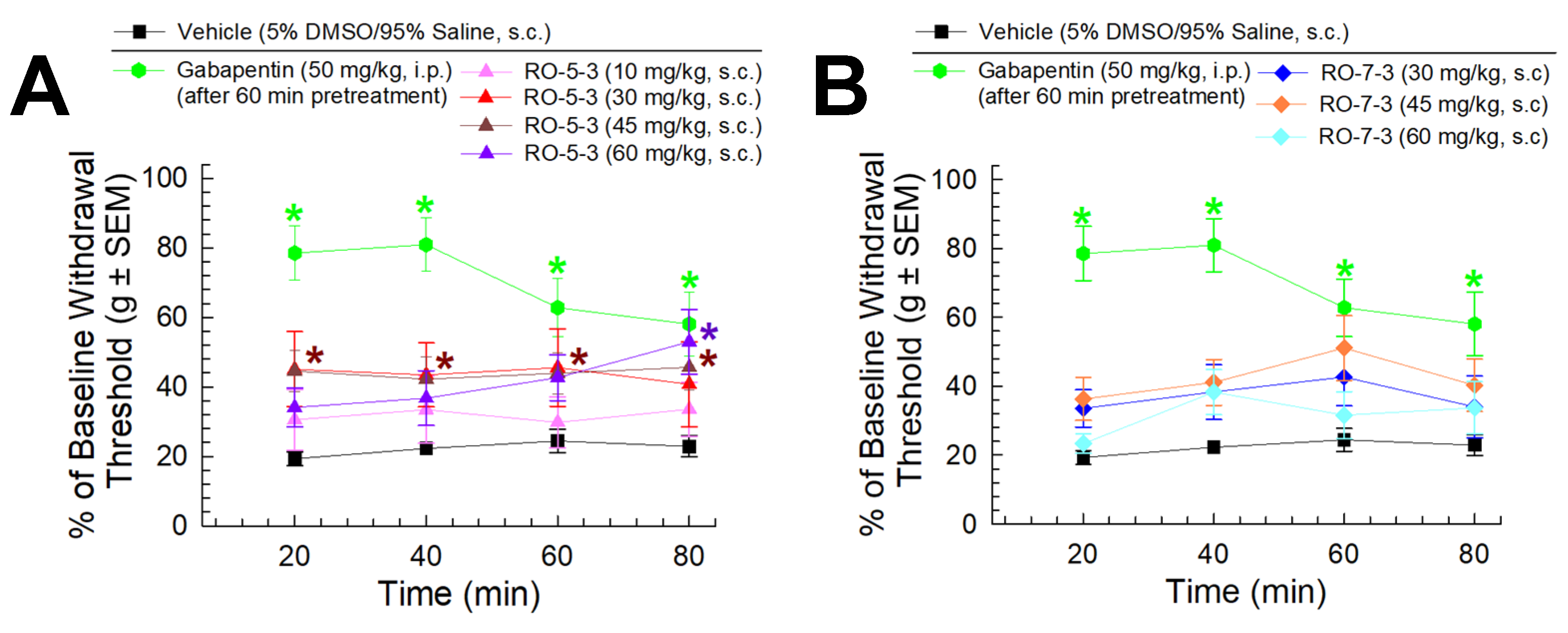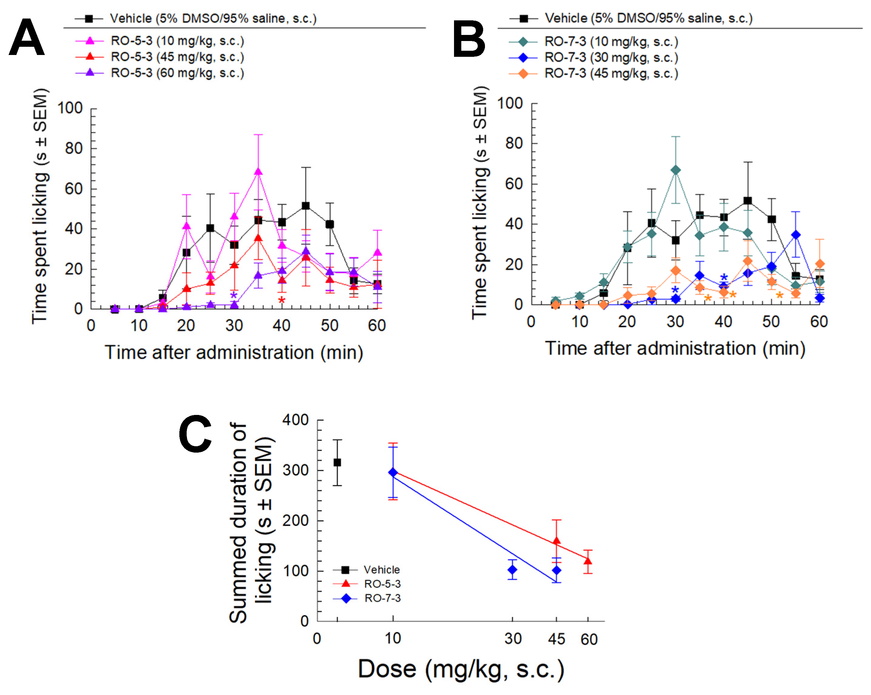 2.4. RO-5-3 and RO-7-3 Induce Dose-Dependent Antinociception in the Mouse Formalin Model of Inflammatory Nociception