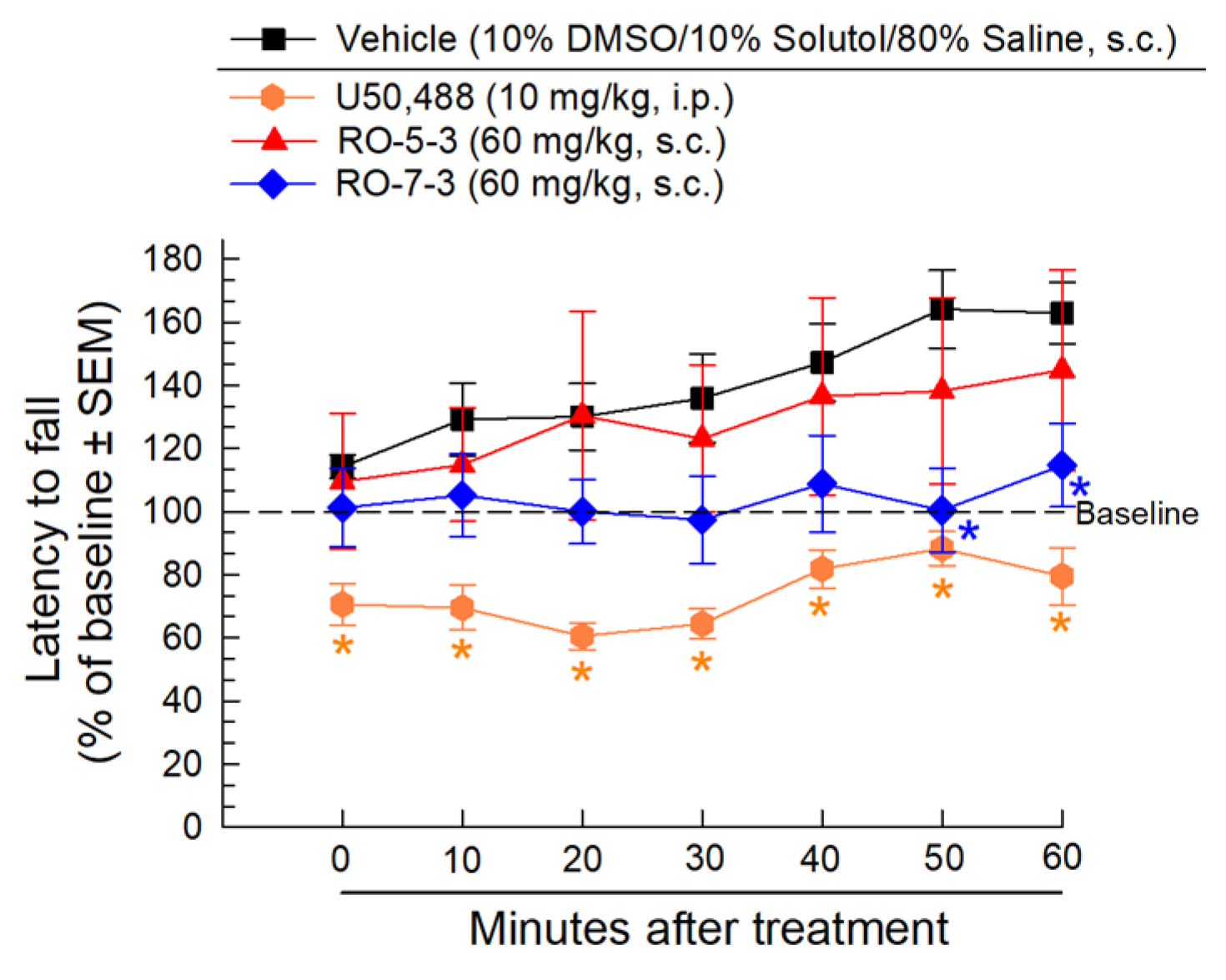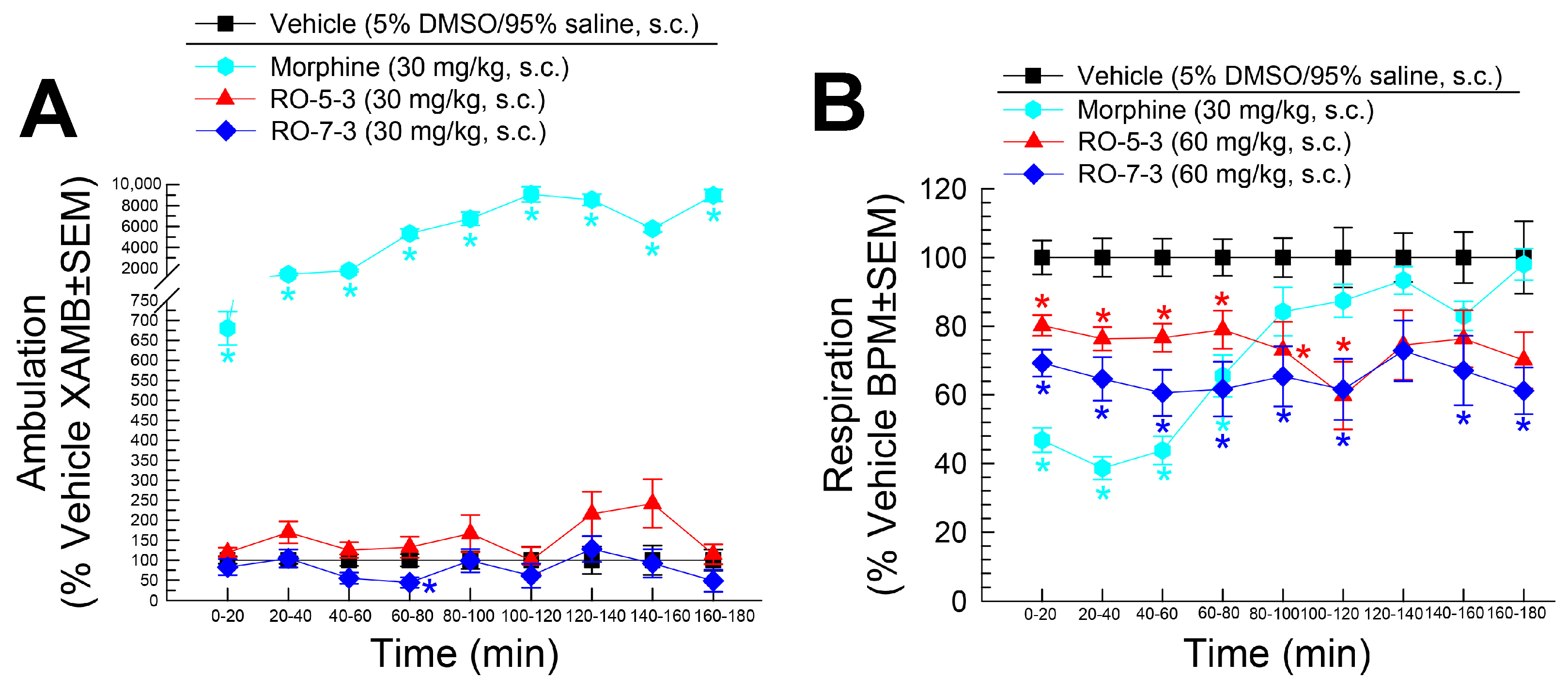 2.5. Evaluation of RO-5-3 and RO-7-3 for Potential Respiratory and Locomotor Impairment