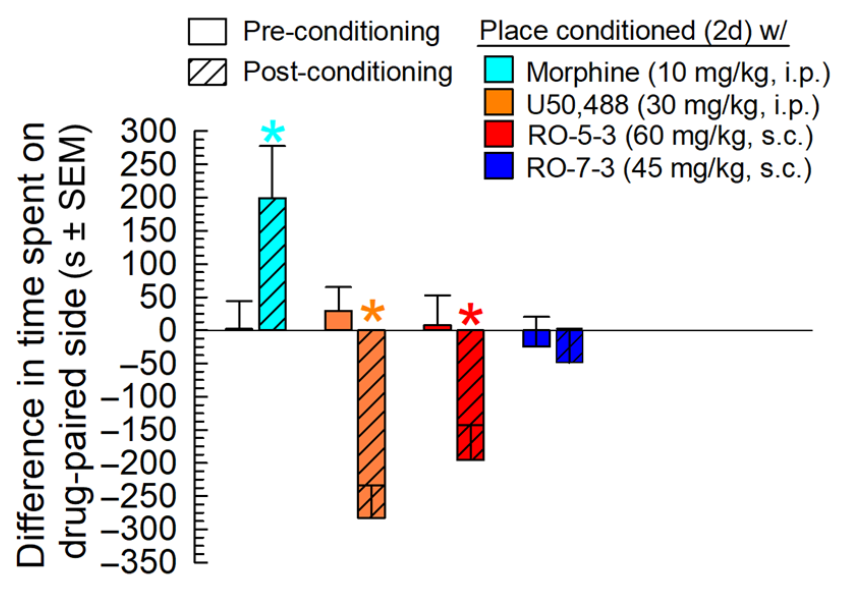 2.6. Evaluation of RO-5-3 and RO-7-3 in the Mouse Conditioned Place Preference Assay