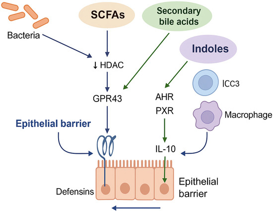 - Fu, Y.; Lyu, J.; Wang, S. The Role of Intestinal Microbes on Intestinal Barrier Function and Host Immunity from a Metabolite Perspective. Front. Immunol. 2023, 14, 1277102. [Google Scholar] [CrossRef] [PubMed]
