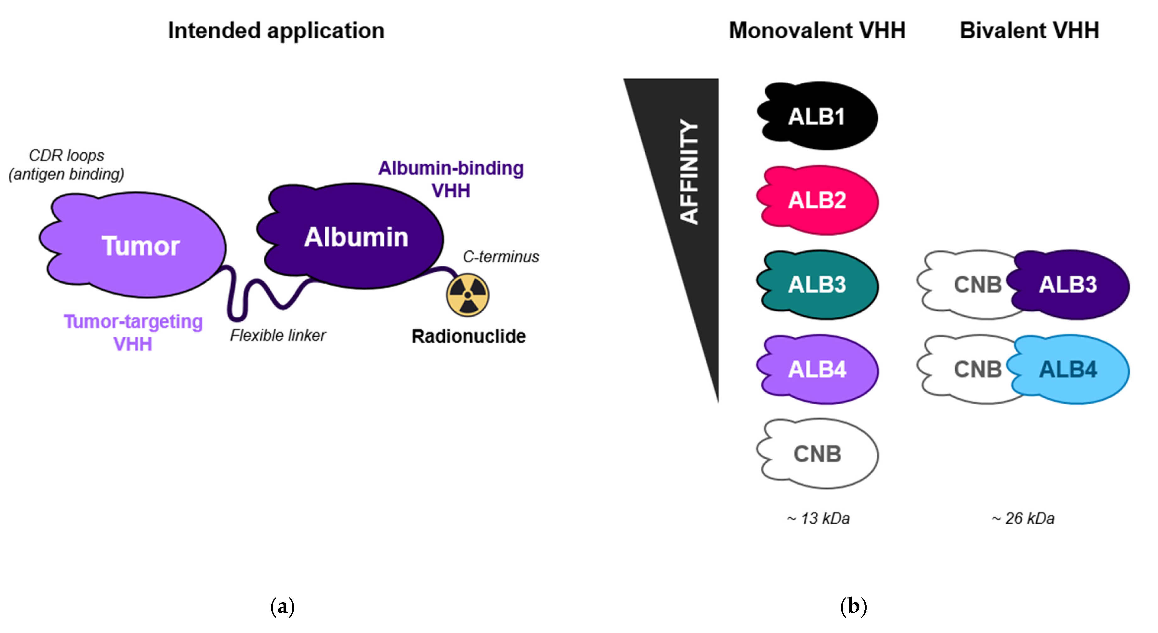 - Cong, Y.; Devoogdt, N.; Lambin, P.; Dubois, L.J.; Yaromina, A. Promising Diagnostic and Therapeutic Approaches Based on VHHs for Cancer Management. Cancers 2024, 16, 371. [Google Scholar] [CrossRef]
