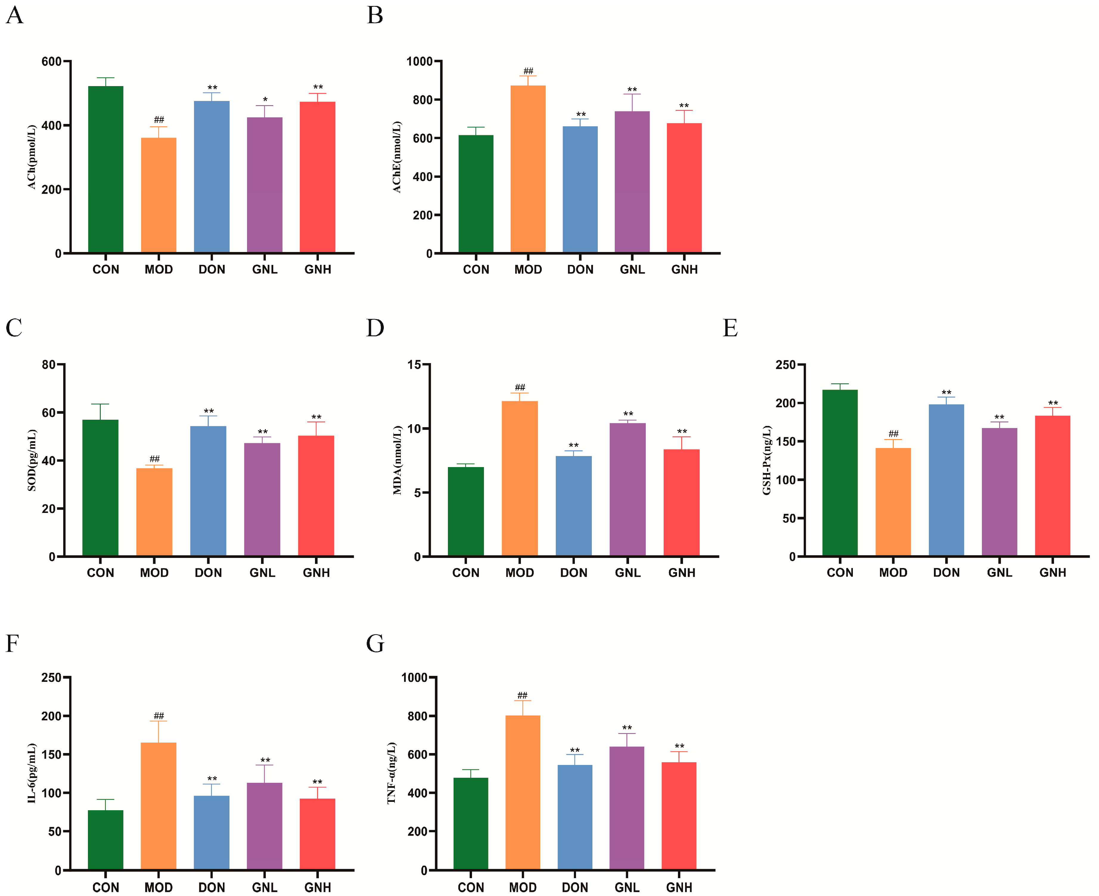 2.3. Effects of GN on Cholinergic Function, Oxidative Stress, and Inflammation in AD Mice