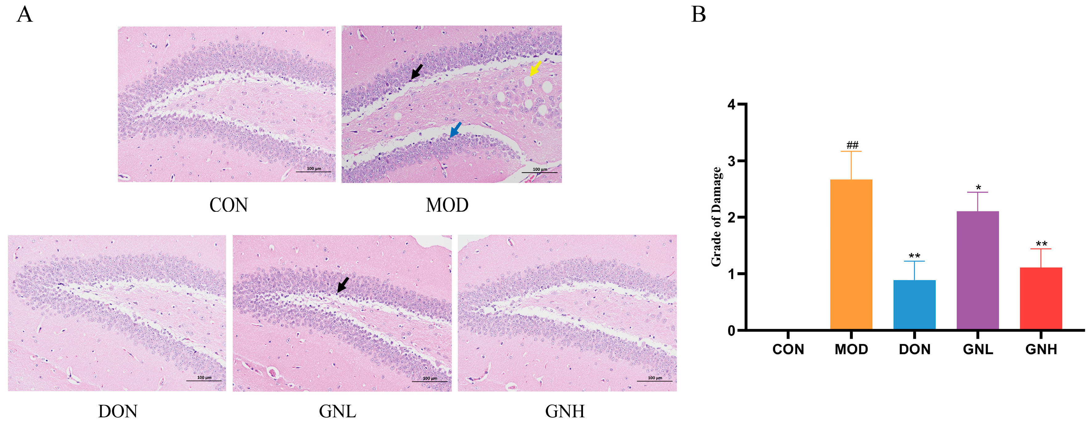 | 2 | Moderate | A portion of neurons were damaged (25–50%), characterized by partial nuclear pyknosis and karyolysis, with disordered cell arrangement. |