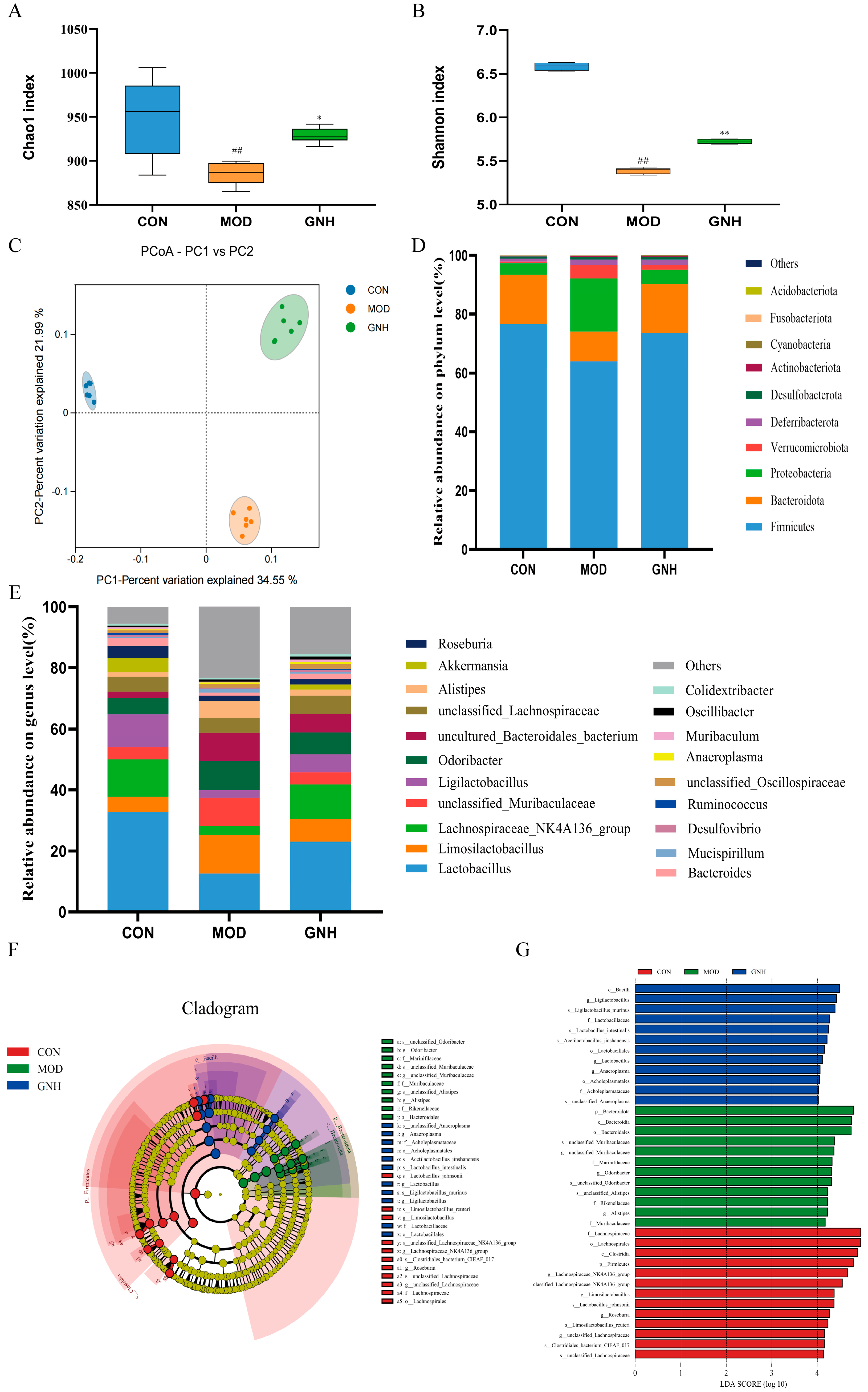 2.5. Effects of GN on the Gut Microbiota in AD Mice