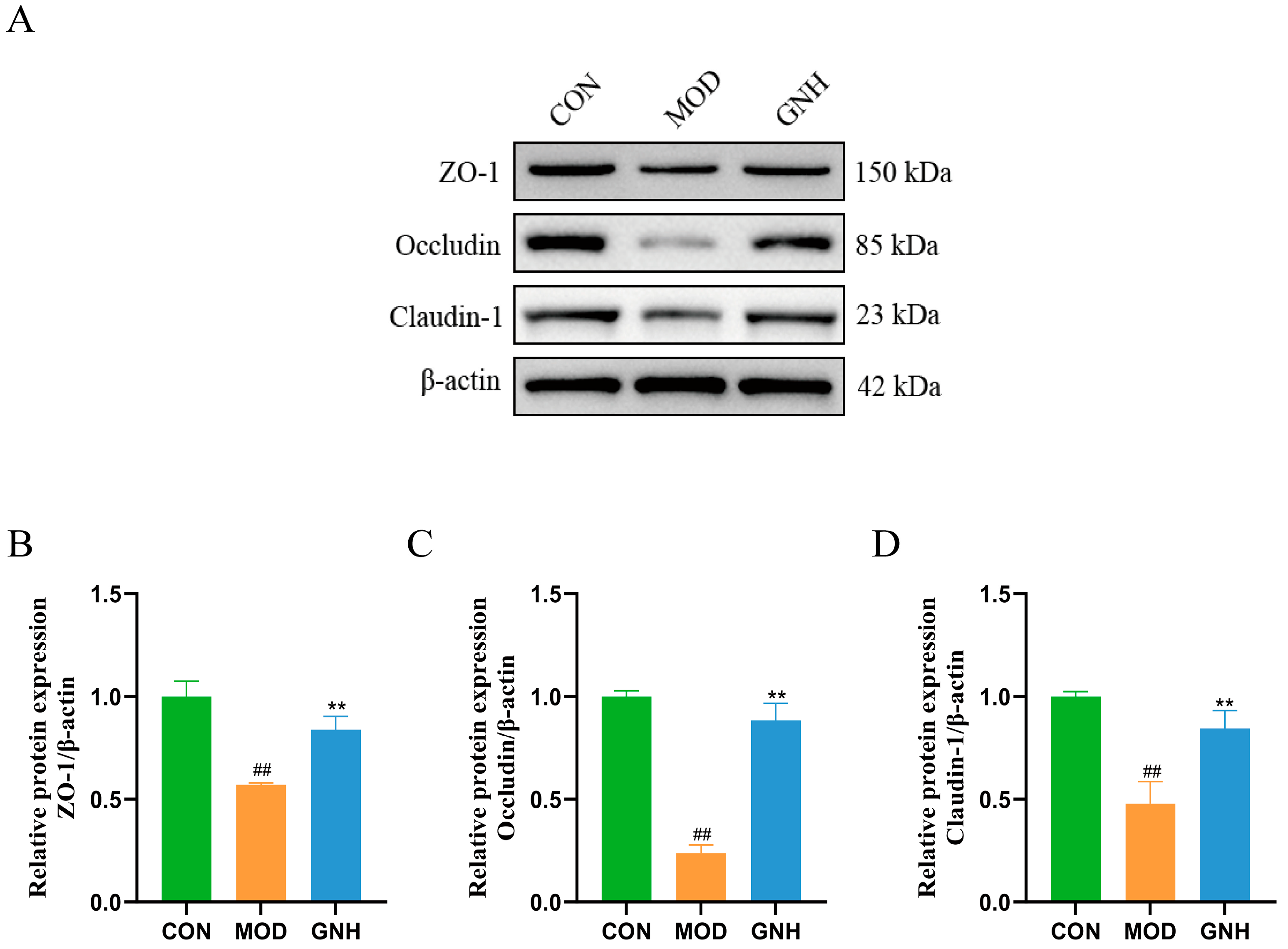 2.8. Effects of GN on Hippocampal ZO-1, Occludin, and Claudin-1 Protein Expression