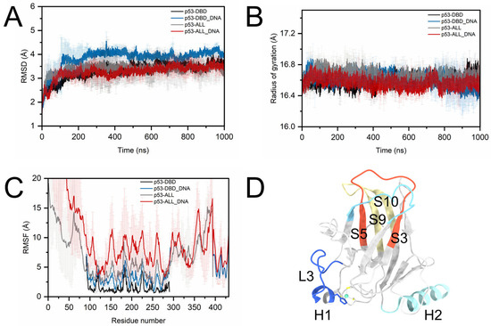 Previous studies for the p53 structure primarily focus on the DBD and DNA binding [26,27,28]. Lambruschini et al.’s study adopted classical molecular dynamics (MD) simulations and Metadynamics to unveil the allosteric mechanisms of the p53 DBD during DNA binding [29]. The local perturbation within the p53 structural network can lead to the transmission of a protein structure. On the other hand, a recent study suggests that the p53 NTD can inhibit binding to DNA and increase p53 DNA binding specificity [13]. The observations for CTD lead to a model for allosteric regulation of p53 and modulate the conversion between latent and activated forms of p53 [21]. However, the mechanism by which the CTD regulates the structure and function of the DBD remains unclear. To understand the regulatory mechanism of p53 functional activity, obtaining the structural details and dynamic characteristics between CTD and DBD upon DNA binding is urgent.