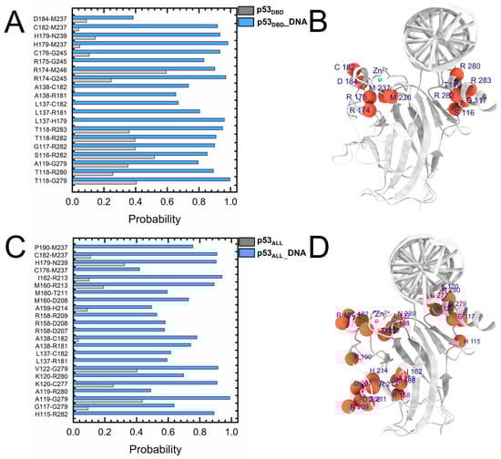 Changes in internal residue contacts within the p53 DBD upon DNA binding. (A) Residue pairs exhibiting high contact probabilities in the p53DBD-DNA. (B) Residues contributing to altered internal interactions within the DBD in the p53DBD-DNA system. (C) Residue pairs with high contact probabilities in the p53ALL-DNA. (D) Residues associated with changes in DBD internal interactions in the p53ALL-DNA system.