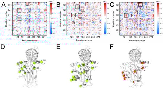 Dynamic correlation changes within the DBD upon DNA binding. (A–C) Difference maps of residue–residue dynamic correlation coefficients. Blue and red grids indicate decreased and increased correlations, respectively. The black boxes highlight regions of significantly enhanced positive correlation within the two systems. (A) p53DBD-DNA vs. p53DBD. (B) p53ALL-DNA vs. p53ALL. (C) p53ALL-DNA vs. p53DBD-DNA. (D–F) Structural mapping of residues involved in dynamic network reorganization. (D) p53DBD-DNA vs. p53DBD. (E) p53ALL-DNA vs. p53ALL. (F) p53ALL-DNA vs. p53DBD-DNA. Regions with altered dynamic correlations in p53DBD-DNA are localized near the DNA-binding interface, whereas changes in p53ALL-DNA involve the entire DBD.