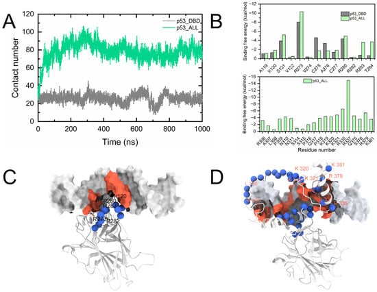 Molecular interactions between p53 and DNA. (A) Coordination number of residue–DNA contacts in the p53DBD-DNA and p53ALL-DNA systems. (B) Per-residue decomposition of binding free energy for the p53DBD-DNA and p53ALL-DNA interactions. (C) Structural view of the interaction interface between the DBD and DNA. (D) Structural view of the interaction interface between the C-terminal domain (CTD) and DNA.
