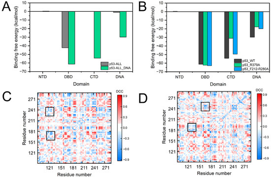 Binding free energy and DCC analysis of p53–DNA interactions in different structural contexts and mutants. (A) Domain-wise contributions to the total binding free energy between p53 and DNA. Values are shown for the full-length protein (p53ALL) and its DNA-bound state (p53ALL-DNA). Negative values indicate favorable binding contributions. (B) The plots compare wild-type (p53_WT) with two mutants: p53_R379A and p53_F212–R280A. (C,D) Difference maps of residue–residue dynamic correlation coefficients. (C) p53ALL-DNA (R379A) vs. p53ALL-DNA. (D) p53ALL-DNA (F212A/R280A) vs. p53ALL-DNA.