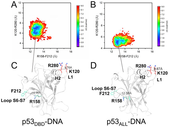 To understand the regulation mechanism of the conformational changes in DBD and DNA binding induced by the CTD, we also constructed the free energy landscape for the p53ALL/p53ALL-DNA. In Figure S9, the RMSD of the DBD increased to 3.6 Å, and the Rg decreased to 16.5 Å upon DNA binding. Simulations by Pradhan et al. suggested that the conformational state of the L1 loop may be related to the motion within the S6-S7 loop [26]. In our simulations, both the p53DBD and p53ALL simulations show the conformational change in the L1 loop upon DNA binding. We used two CVs to concurrently describe the conformational dynamics of the S6-S7 loop and L1 loop. The x-axis represents the distance between the CA atoms of residues R158 and F212, and the y-axis represents the distance between the CA atoms of K120 and R280. In the simulation of p53DBD-DNA (Figure 7A), the distance between the CA atoms of R280 and K120 is 5.70 Å after DNA binds to DBD, and the distance between the CA atoms of F212 and R158 is 12.96 Å. In the p53ALL-DNA simulation (Figure 7B), the distance between the CA atoms of R280 and K120 further decreases to 4.87 Å after CTD binds to DNA, indicating that the L1 and H2 move closer together. This conformation facilitates the simultaneous insertion of L1 and H2 into the DNA major groove. Meanwhile, the distance between F212 and R156 also shortens to 12.08 Å (Figure 7C,D), and the conformational change in the S6-S7 loop promotes allosteric regulation within the DBD, which is consistent with previous simulation studies of the DBD region [29]. Interestingly, both K120 and R280 are located at the DNA-binding interface and carry positive charges. The decreased distance between these residues enhances DBD-DNA binding affinity through favorable electrostatic interactions and promotes the second transition of the DBD structure.