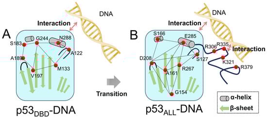 The conformational states of the S6-S7 loop and L1 loop upon DNA binding induce the more compact structure of the p53 DBD, which is favorable for the internal network connections. The DCC analysis (Figure 4C) shows the correlation nodes within the DBD of the p53ALL-DNA. The structural network of the DBD is mainly composed of F212 from the S6-S7 loop, E285 from the H2 helix, S166 from H1, and S127 from the L1 loop (Figure 4F). Therefore, the amino acids of S4 and S10 act as connecting units between the S6-S7 loop, H2 helix, and the L1 loop. These results indicate that the conformation of DBD binding to DNA is mediated by the conformational changes in the global network. The conformation shift (S6-S7 loop) is crucial for the recruitment of biological partners. The CTD further promotes the allosteric regulation of the DBD conformation and the subsequent protein–protein interactions. Moreover, the CTD-mediated stabilization of the DBD-DNA complex and the modulation of its conformational dynamics likely facilitate the subsequent recruitment of coactivators (such as MDM2/p300) and other transcription machinery, which are essential for p53′s transcriptional activity [21,24].