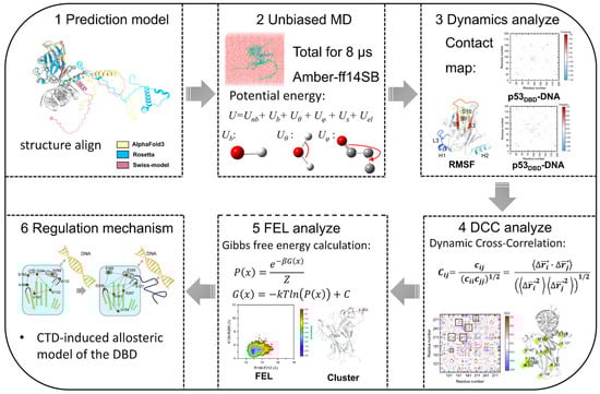 We integrated dynamics and thermodynamic analyses to explore the allosteric mechanism of p53 CTD regulating DBD structure and DNA binding. The workflow of the unbiased molecular dynamics (MD) method is illustrated in Figure 9. First, we employed multiple structure prediction software to perform structural modeling of the p53 protein, facilitating subsequent assessment of the robustness of the structural mechanisms. Second, unbiased MD simulations were performed for the four p53 complex systems. Third, residue contact maps and atomic fluctuations were analyzed to characterize the binding interactions between the p53 DBD/CTD and DNA. Fourth, dynamic cross-correlation network analysis was applied to examine changes in the internal interaction network of DBD upon DNA and CTD binding. Fifth, the free energy landscape (FEL) analysis was performed to identify key conformations associated with CTD-mediated regulation of the DBD network, followed by cluster analysis. Finally, the allosteric regulatory mechanism of DBD induced by CTD binding was summarized.