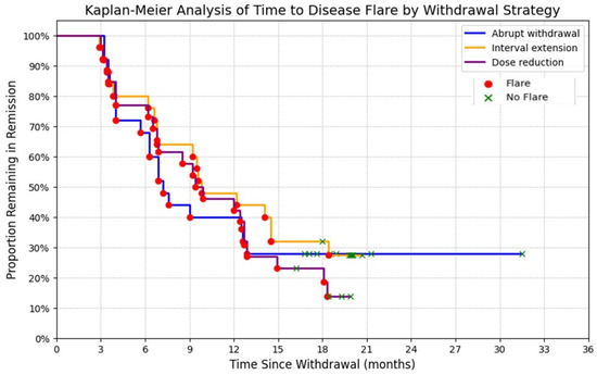 Several limitations of this study should be acknowledged. First, clinical assessments and flare evaluations were not blinded to the withdrawal strategy. Although evaluations were performed by a consensus of the treating physician, the head of the department, and the study investigator, rather than by a single assessor, the lack of blinded or duplicate review may have introduced observer bias. In addition, part of the data was extracted from electronic medical records, which may be subject to incomplete documentation or variability in routine clinical practice.