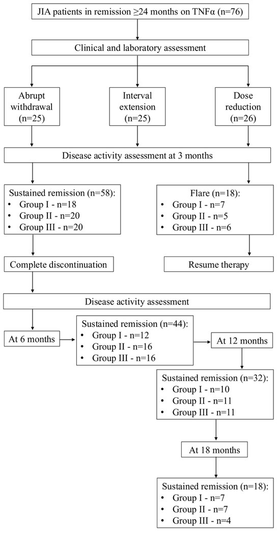 Patients were randomized in a 1:1:1 ratio using a computer-generated randomization sequence created by a study investigator. Allocation concealment was ensured by the use of sequentially numbered, opaque, sealed envelopes prepared in advance and opened only after patient enrollment and written informed consent. Neither the treating physicians nor the patients were aware of the upcoming group assignment prior to envelope opening. No crossover between withdrawal strategies was allowed after randomization, and all patients remained in their originally assigned tapering arms. Patients were allocated into three groups with predefined withdrawal strategies: Group I (abrupt withdrawal): immediate discontinuation of the TNF-α inhibitor; Group II (interval extension): gradual extension of dosing intervals (etanercept 0.8 mg/kg every two weeks instead of weekly; adalimumab 24 mg/m2 every four weeks instead of every two weeks), with intervals doubled until withdrawal if remission persisted; and Group III (dose reduction): gradual tapering of the dose while maintaining injection frequency (etanercept 0.4 mg/kg weekly; adalimumab 12 mg/m2 every two weeks). In Groups II and III, biologic therapy was discontinued entirely if remission persisted for at least 3 months after dose modification (Table 3).
