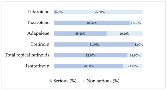 Distribution of serious and non-serious cases among retinoid products based on EMA ADRreports aggregated outputs.