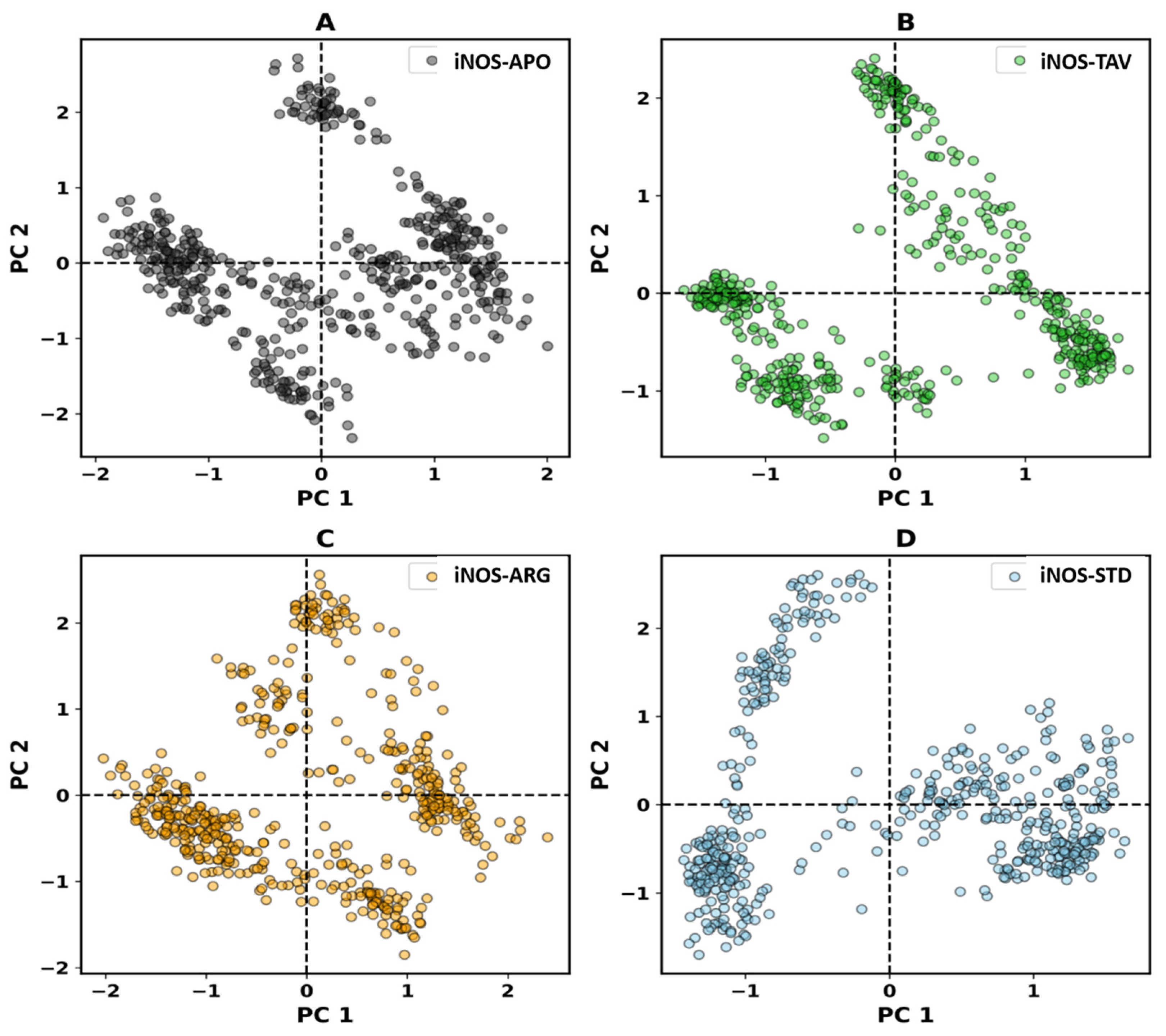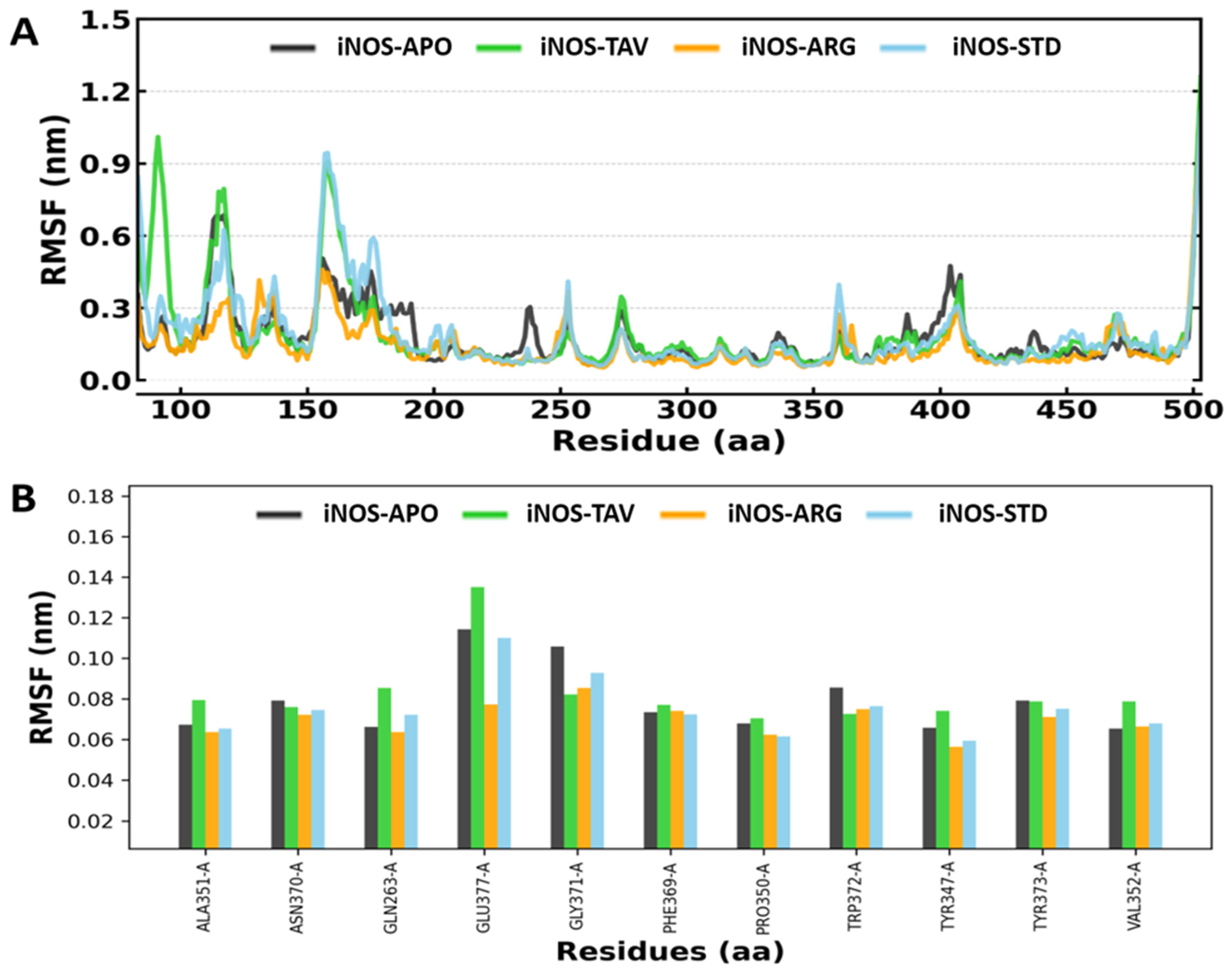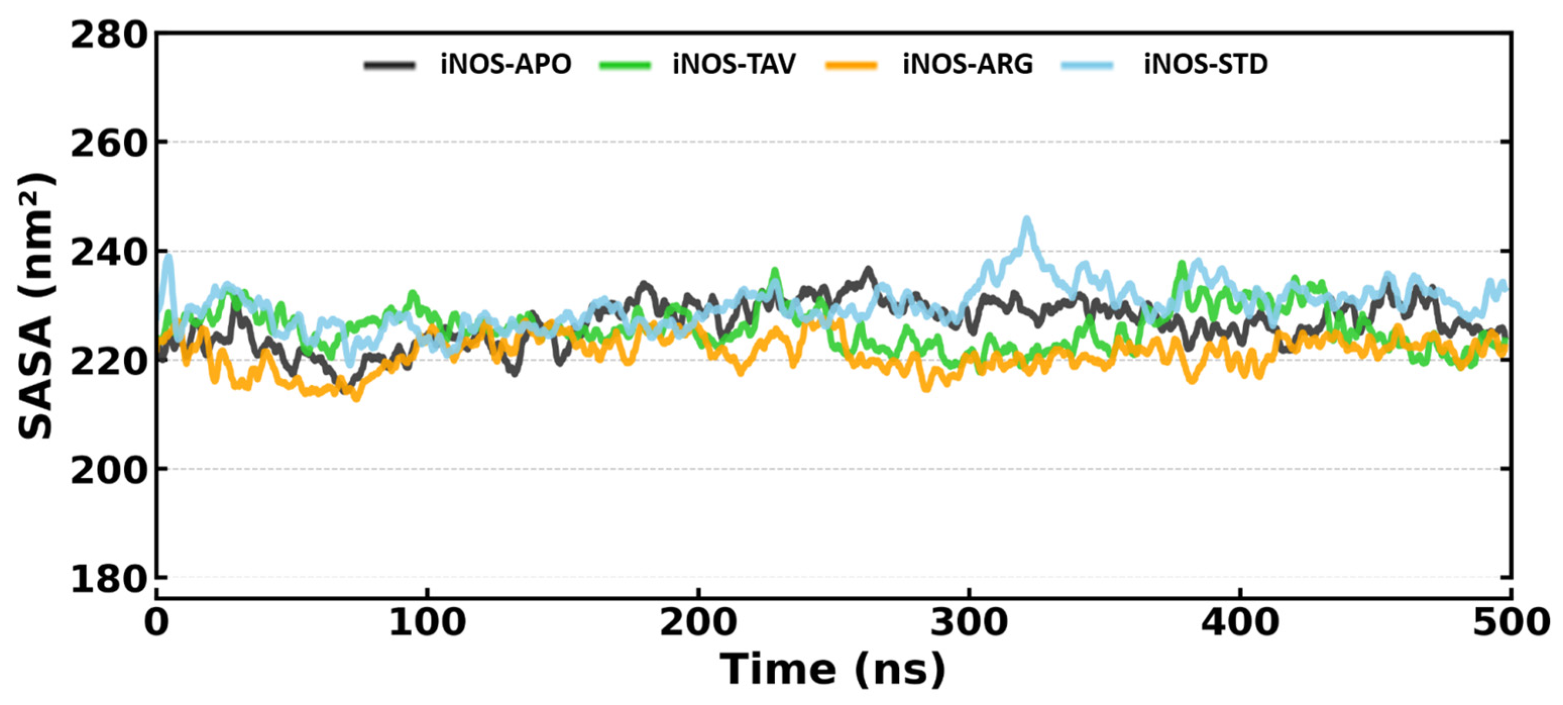 | iNOS-ARG | −51.802 +/− 5.279 kJ/mol | −144.113 +/− 17.168 kJ/mol | 234.668 +/− 12.907 kJ/mol | 29.841 +/− 13.121 kJ/mol |