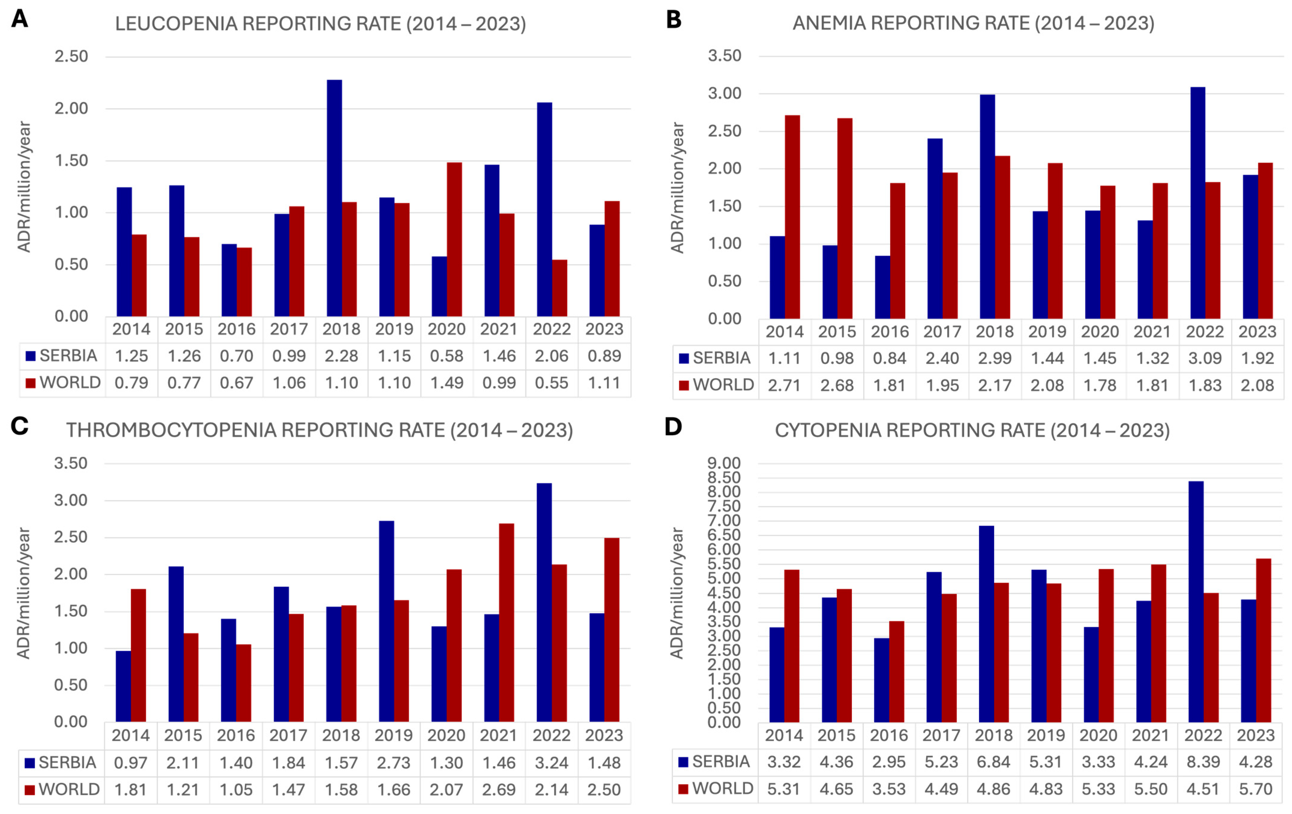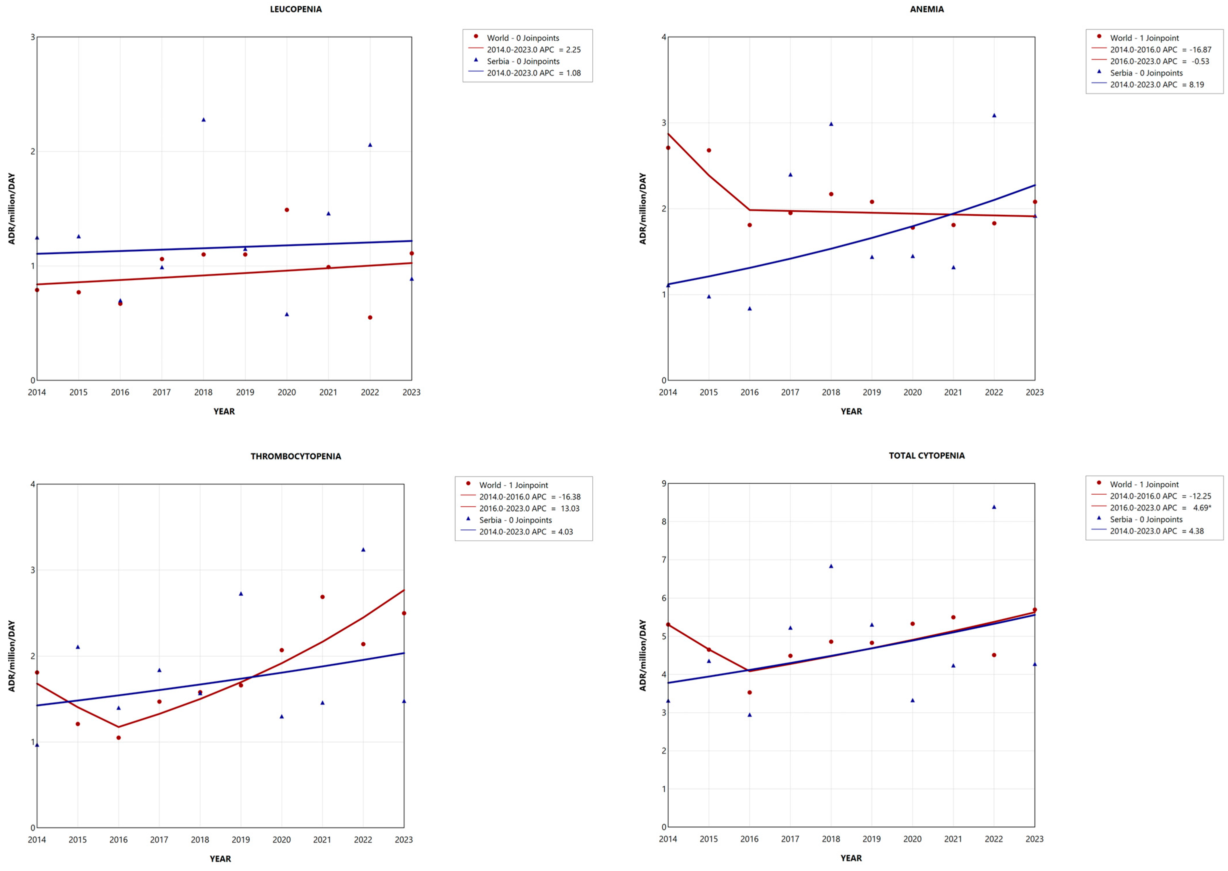 Stević, I.; Janković, S.M.; Mihailović, M.; Jović, I.; Odalović, M.; Marinković, V.; Lakić, D. Cytopenias as Adverse Drug Reactions: A 10-Year Analysis of Reporting Structure, Rate, and Trend. Pharmaceuticals 2026, 19, 14. https://doi.org/10.3390/ph19010014