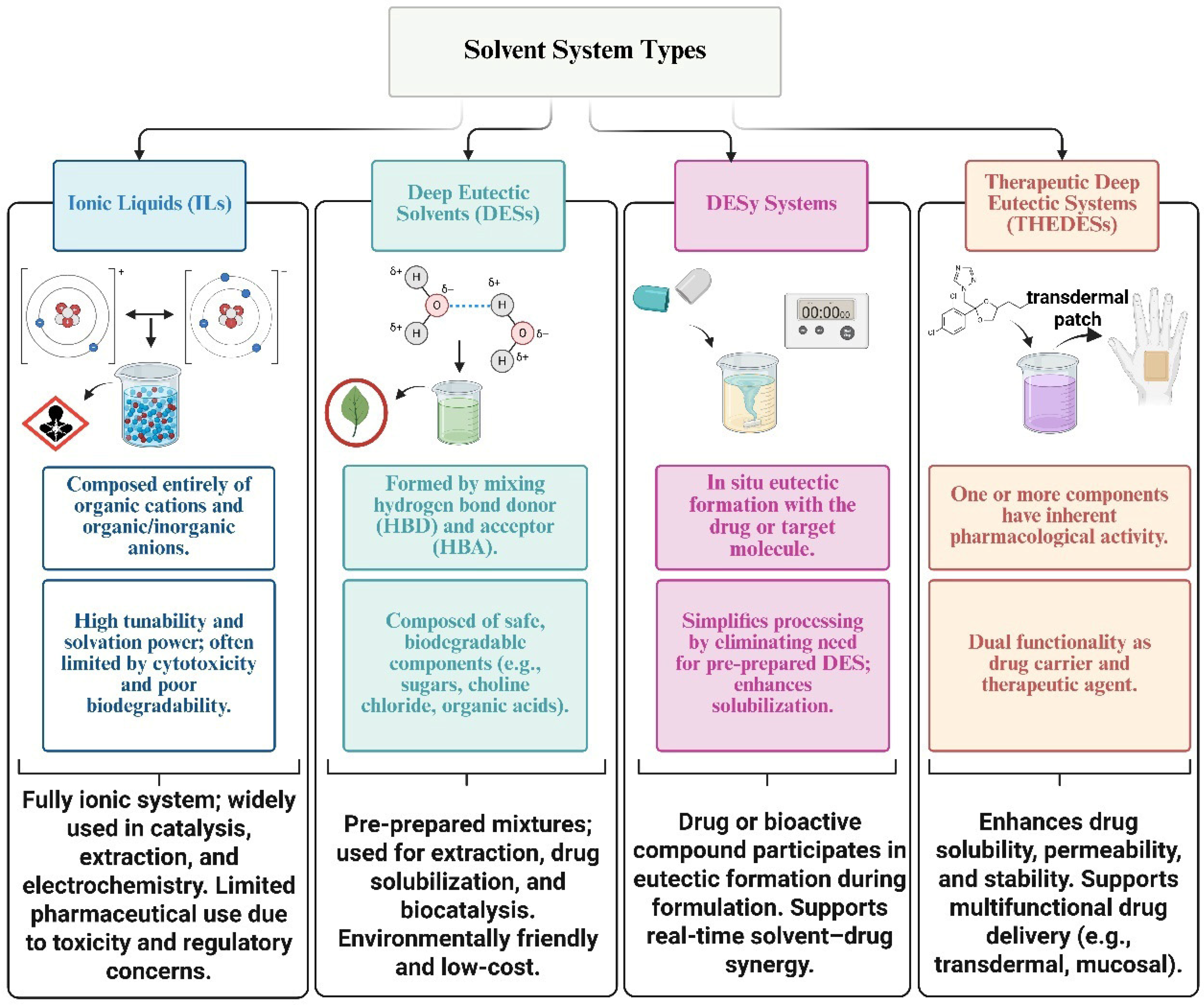 | Composition | Organic/inorganic blends of solid compounds | Mixtures of H-bond donors and acceptors (ionic or non-ionic) | Pure salts: discrete organic cations and inorganic/organic anions | In situ mixtures formed with the active compound as part of the eutectic system |
