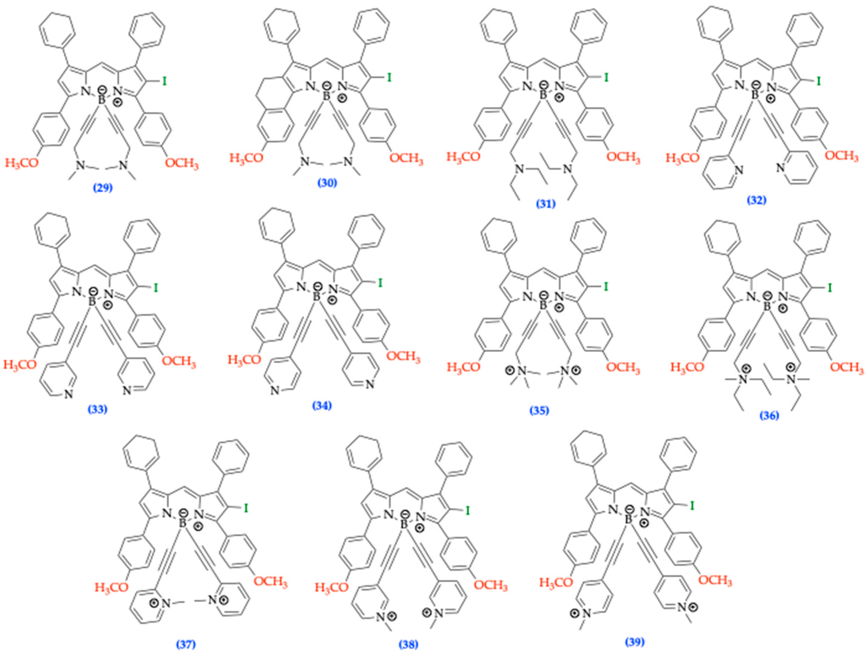 | O’Shea’s [35] | 20–50% [36] | Tetraphenyl Aza-BODIPY Dimethylamino Aza-BODIPY | Both |