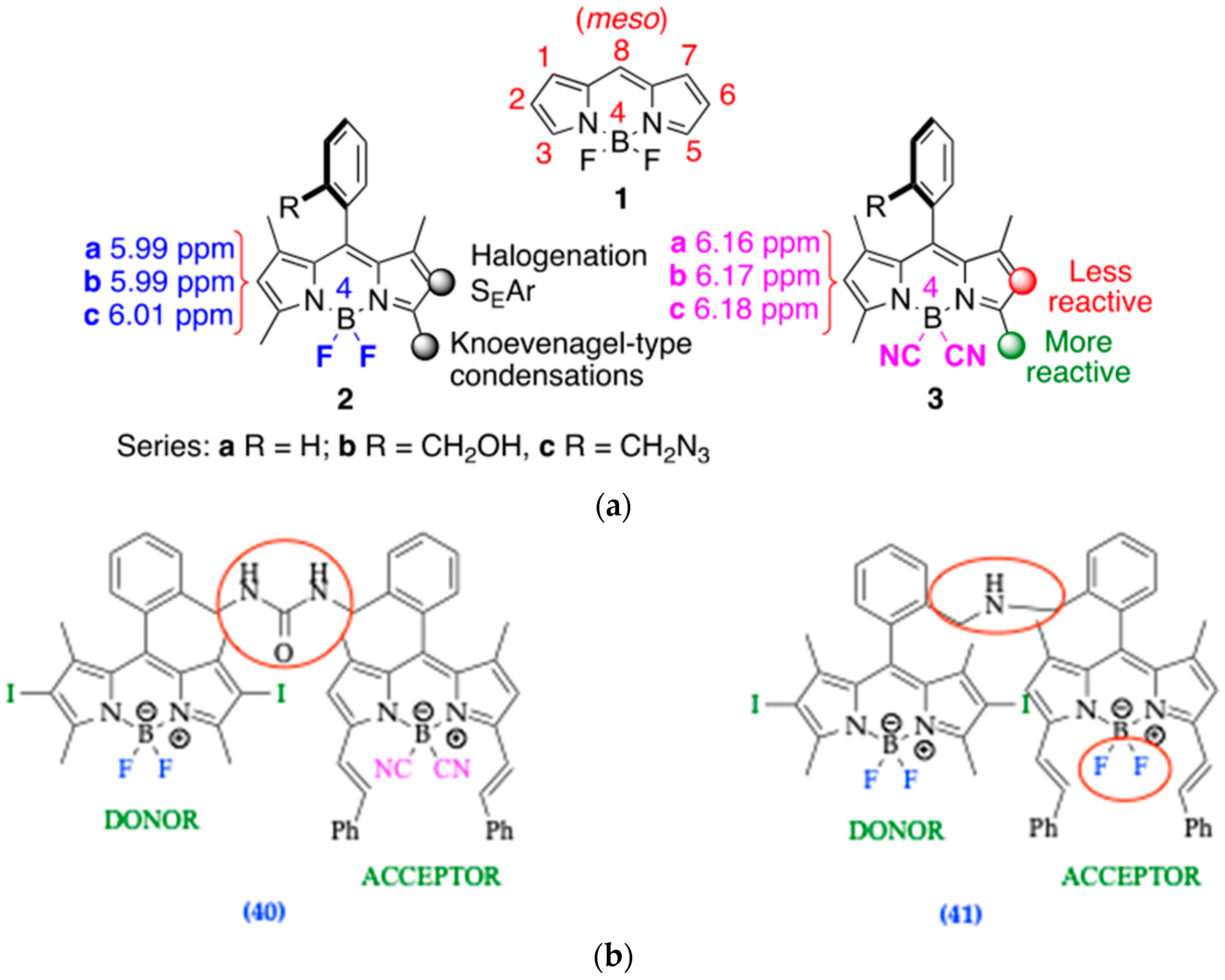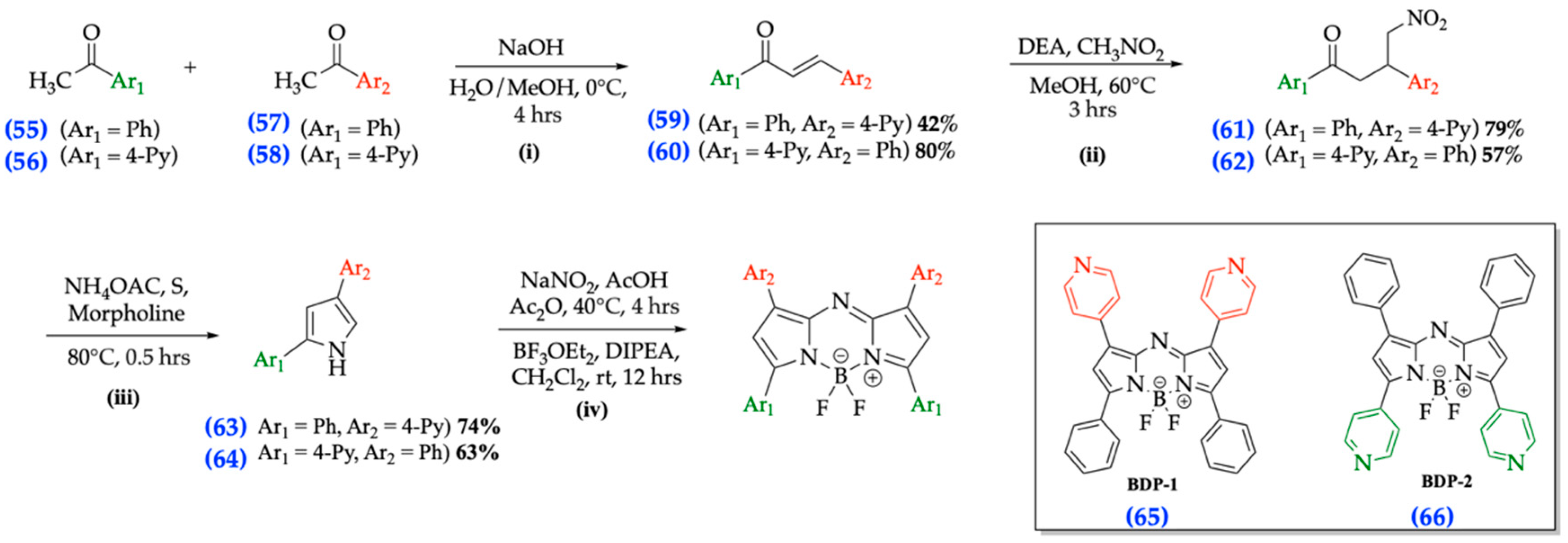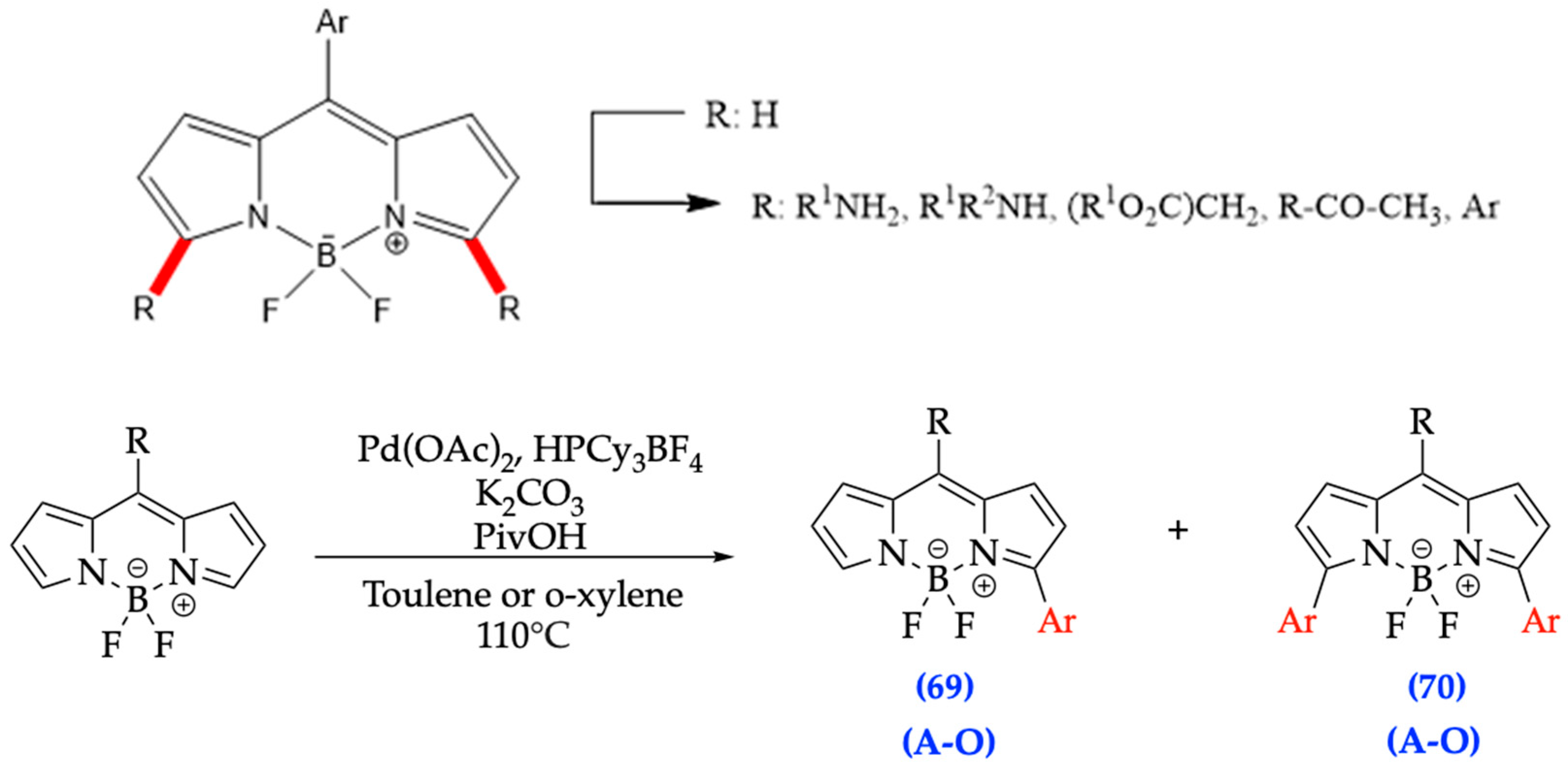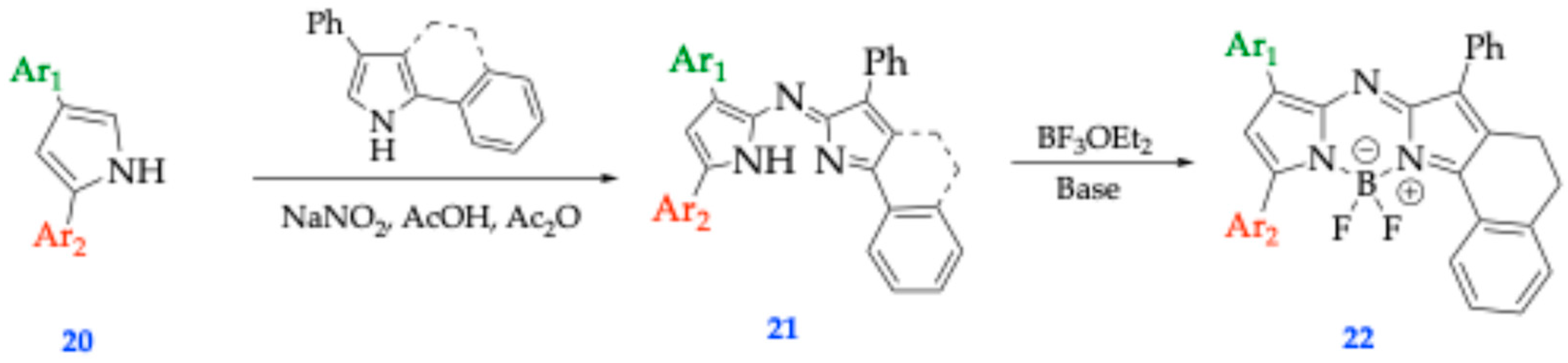 | Carriera’s [37] | 60–90% [36] | Cyclized 2,4-diaryl pyrroles complexed with BF3OEt2 | Both |