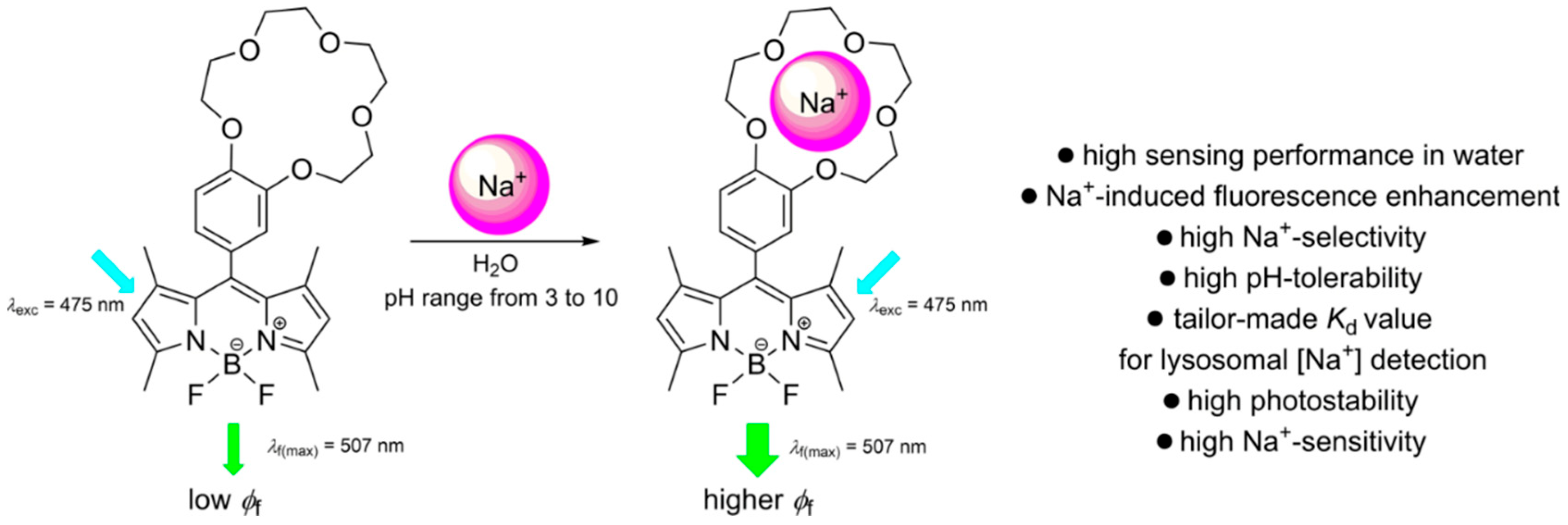 - Salim, M.M.; Owens, E.A.; Gao, T.; Lee, J.H.; Hyun, H.; Choi, H.S.; Henary, M. Hydroxylated near-infrared BODIPY fluorophores as intracellular pH sensors. Analyst 2014, 139, 4862–4873. [Google Scholar] [CrossRef] [PubMed] [PubMed Central]