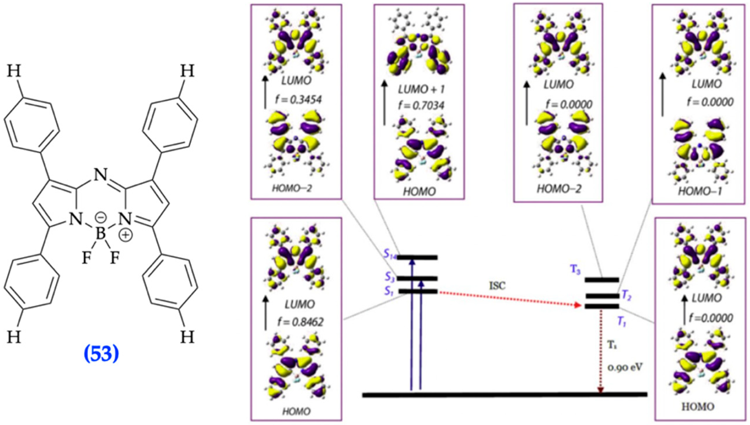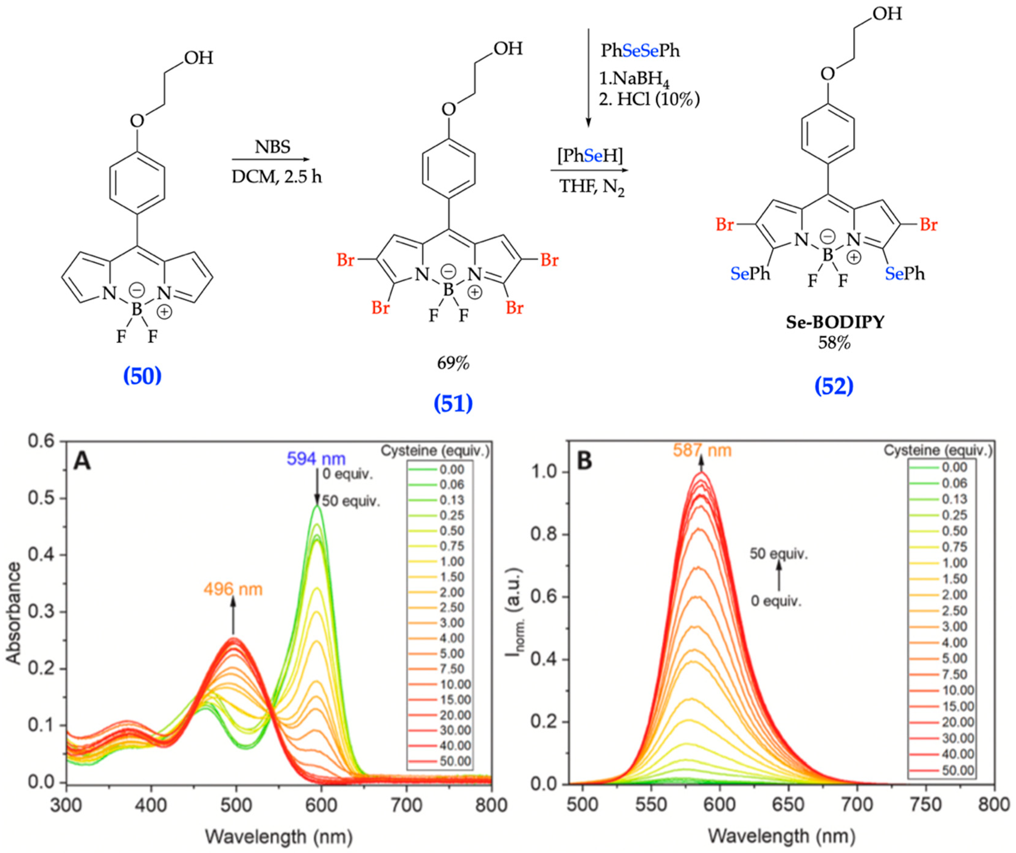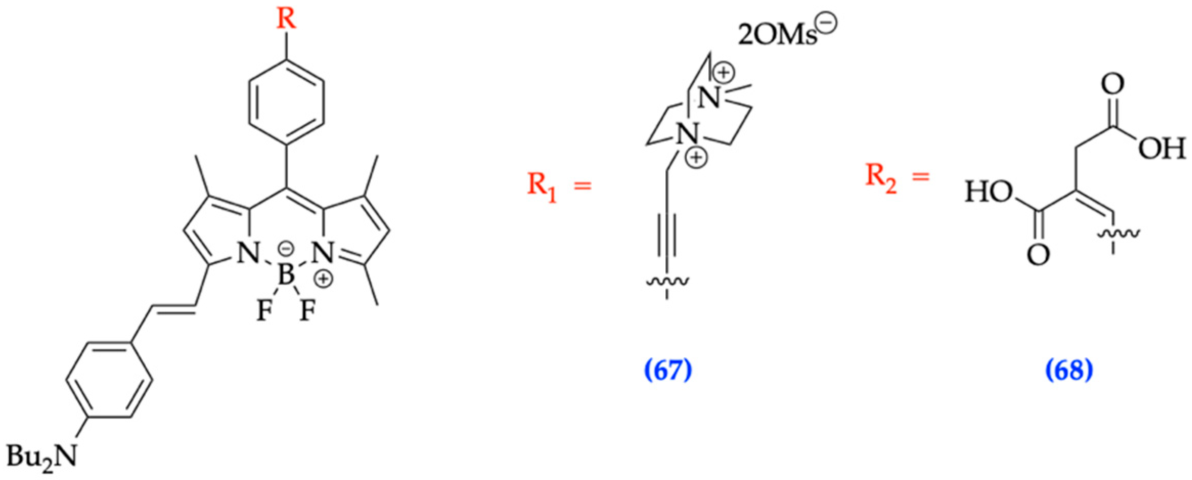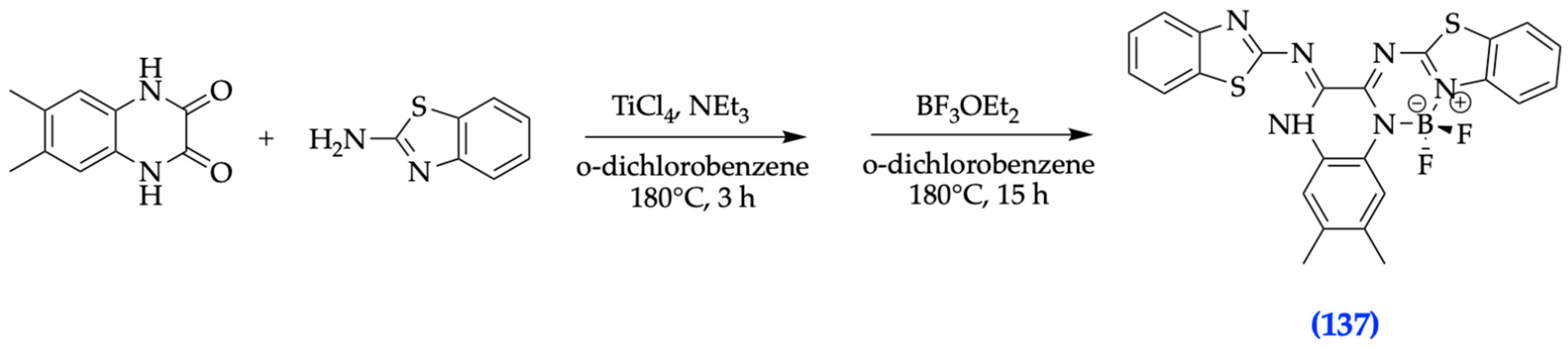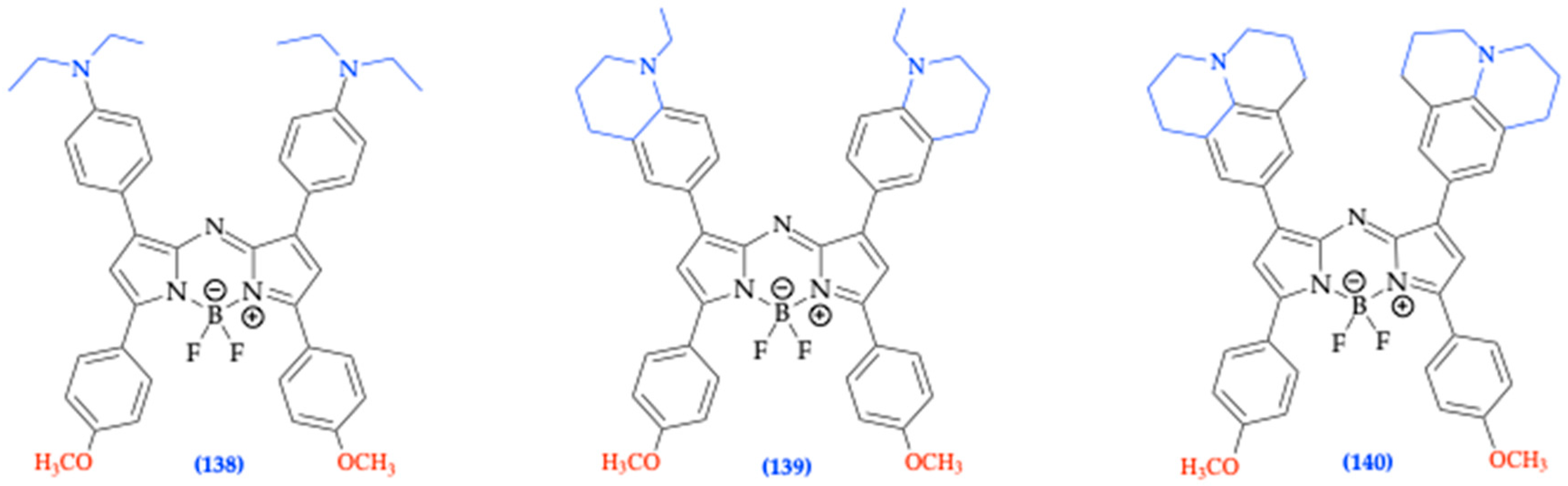 - Merkushev, D.; Vodyanova, O.; Telegin, F.; Melnikov, P.; Yashtulov, N.; Marfin, Y. Design of Promising aza-BODIPYs for Bioimaging and Sensing. Designs 2022, 6, 21. [Google Scholar] [CrossRef]