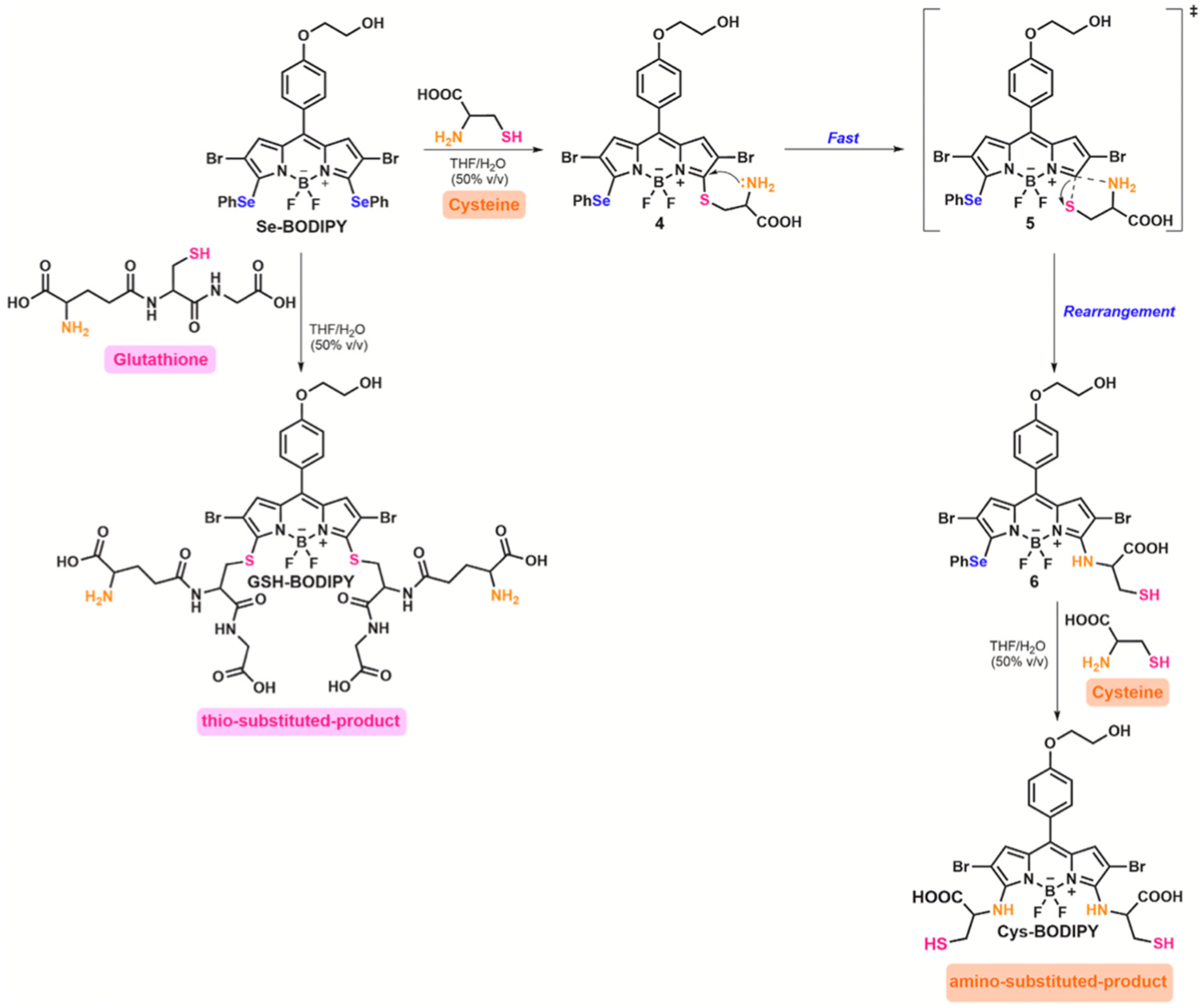 - Ye, Y.; Sun, J.; Tang, F.; Xie, R.; Wang, H.; Ding, A.; Pan, S.; Li, L. Mitochondria-Targeting BODIPY Probes for Imaging of Reactive Oxygen Species. Adv. Sens. Res. 2023, 2, 2300057. [Google Scholar] [CrossRef]