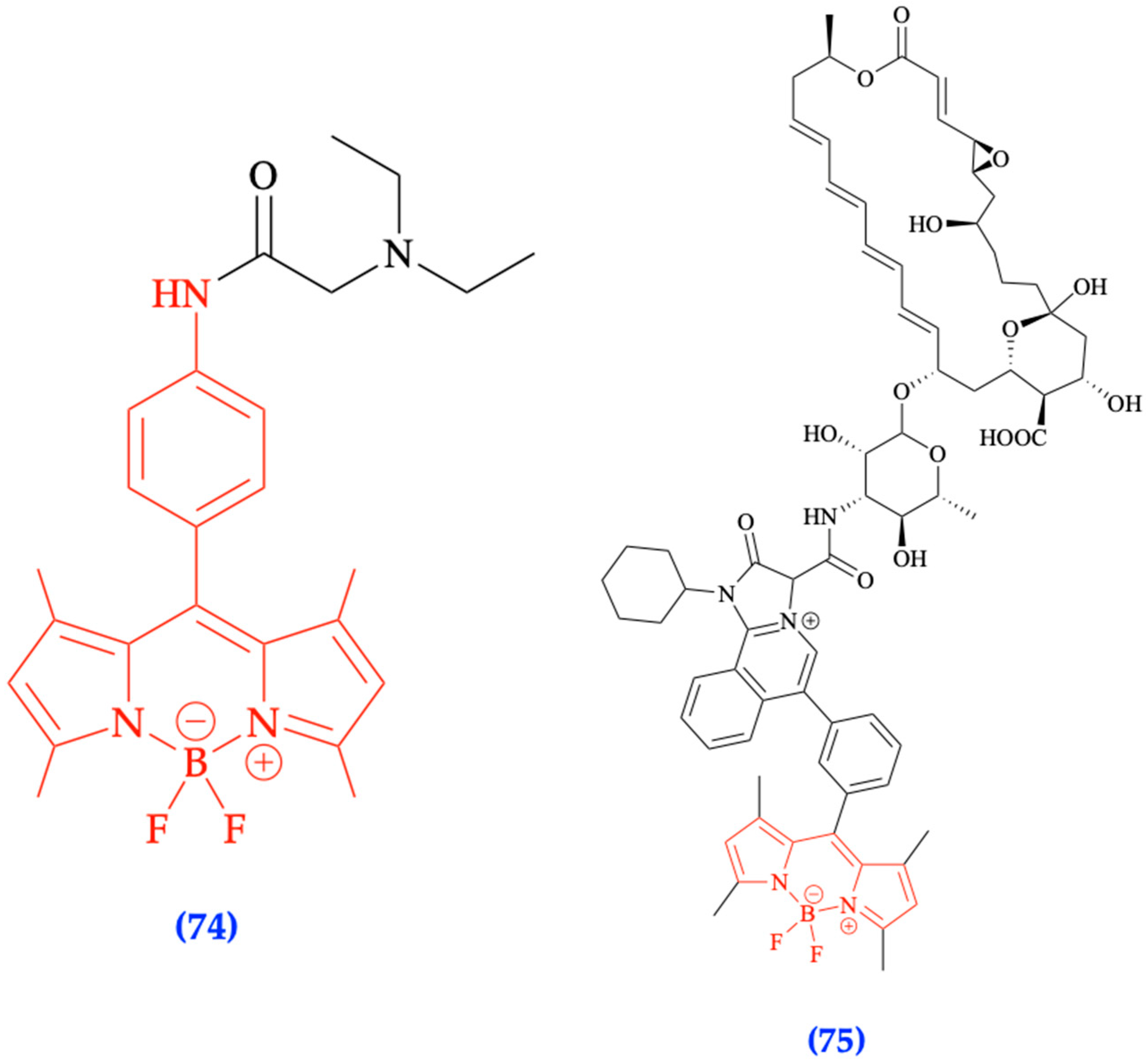 - Samanta, S.; Lai, K.; Wu, F.; Liu, Y.; Cai, S.; Yang, X.; Qu, J.; Yang, Z. Xanthene, cyanine, oxazine and BODIPY: The four pillars of the fluorophore empire for super-resolution bioimaging. Chem. Soc. Rev. 2023, 52, 7197–7261. [Google Scholar] [CrossRef]