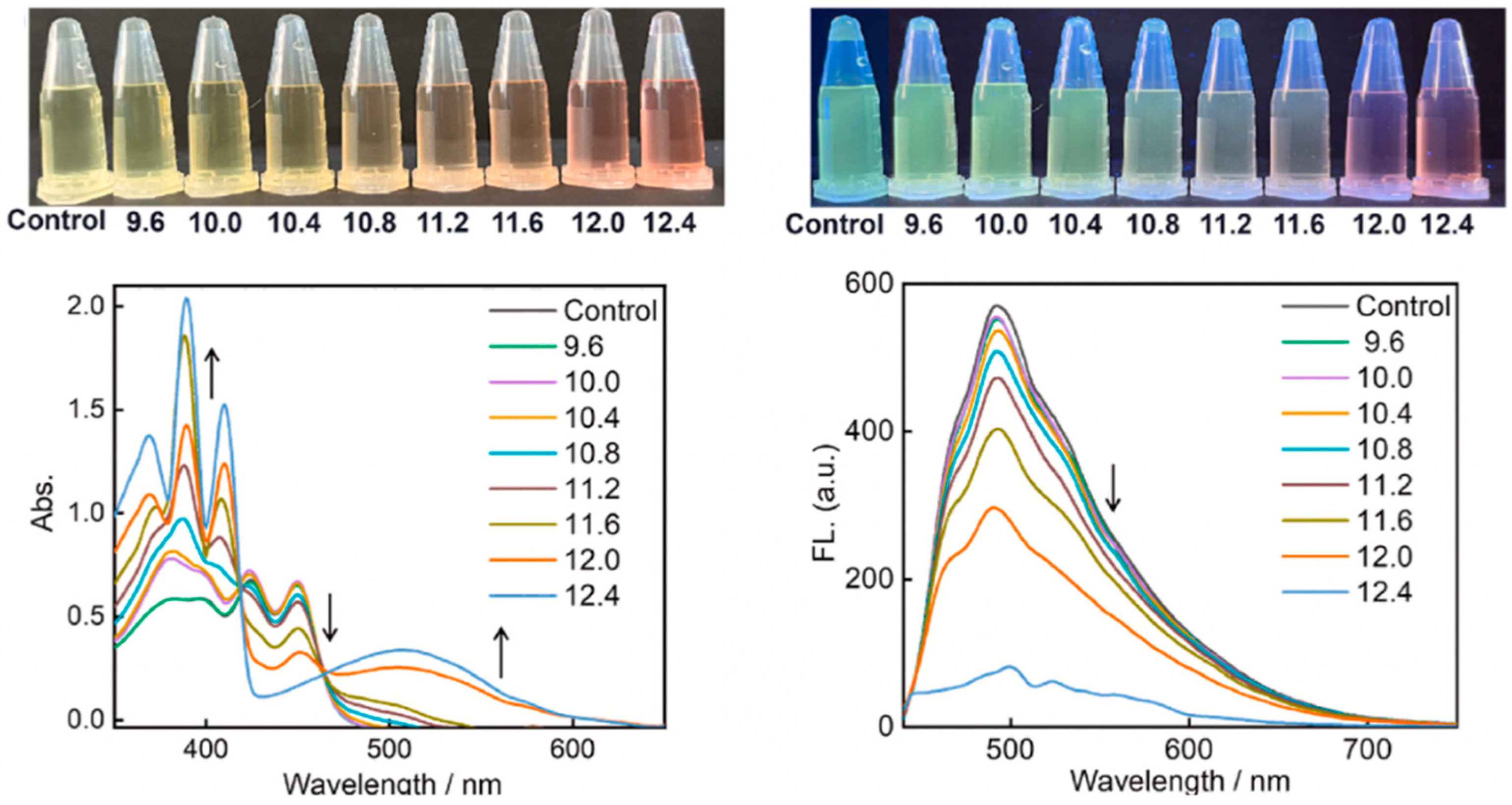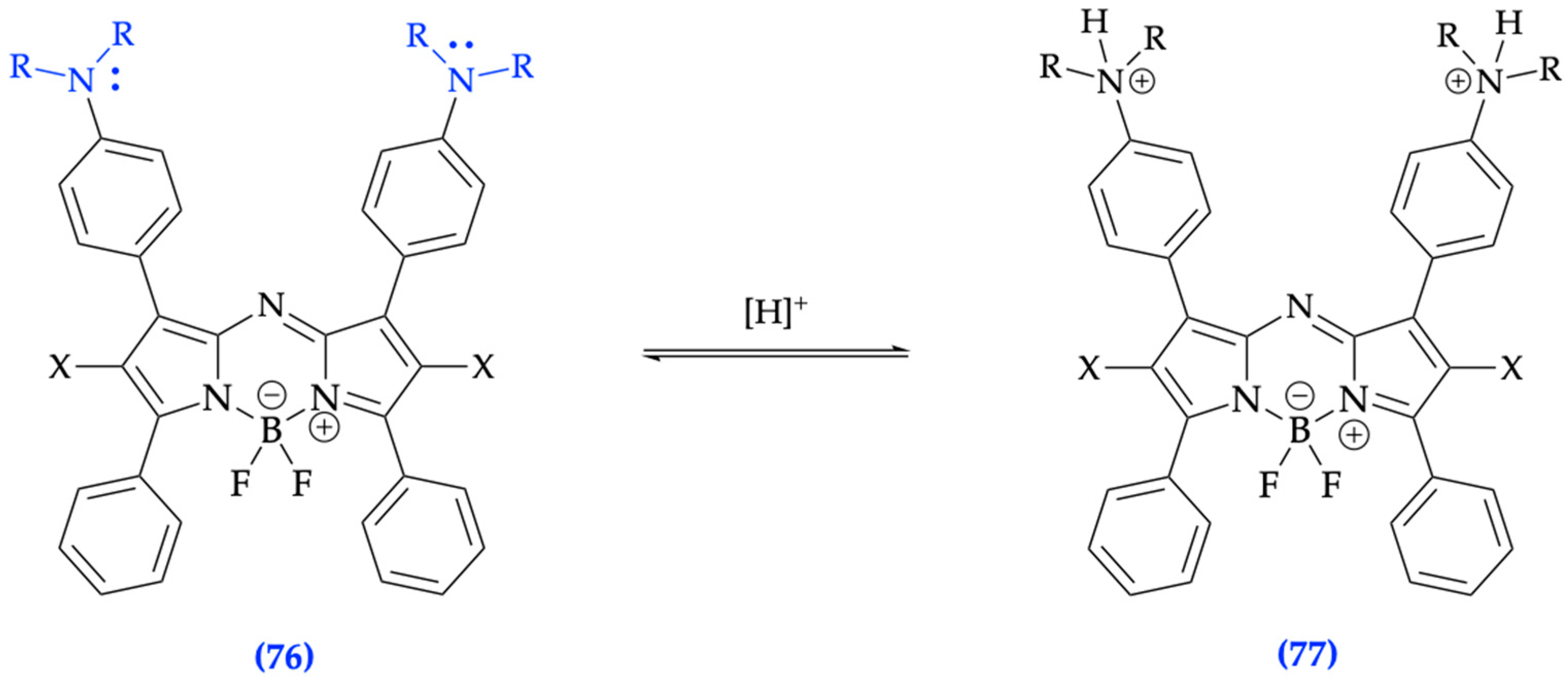 - Chen, Z.; Shimizu, S.; Ji, S.; Pan, J.; Wang, Y.; Feng, R. A novel BODIPY-based fluorescent probe for naked-eye detection of the highly alkaline pH. Spectrochim. Acta Part A Mol. Biomol. Spectrosc. 2025, 325, 125083. [Google Scholar] [CrossRef] [PubMed]