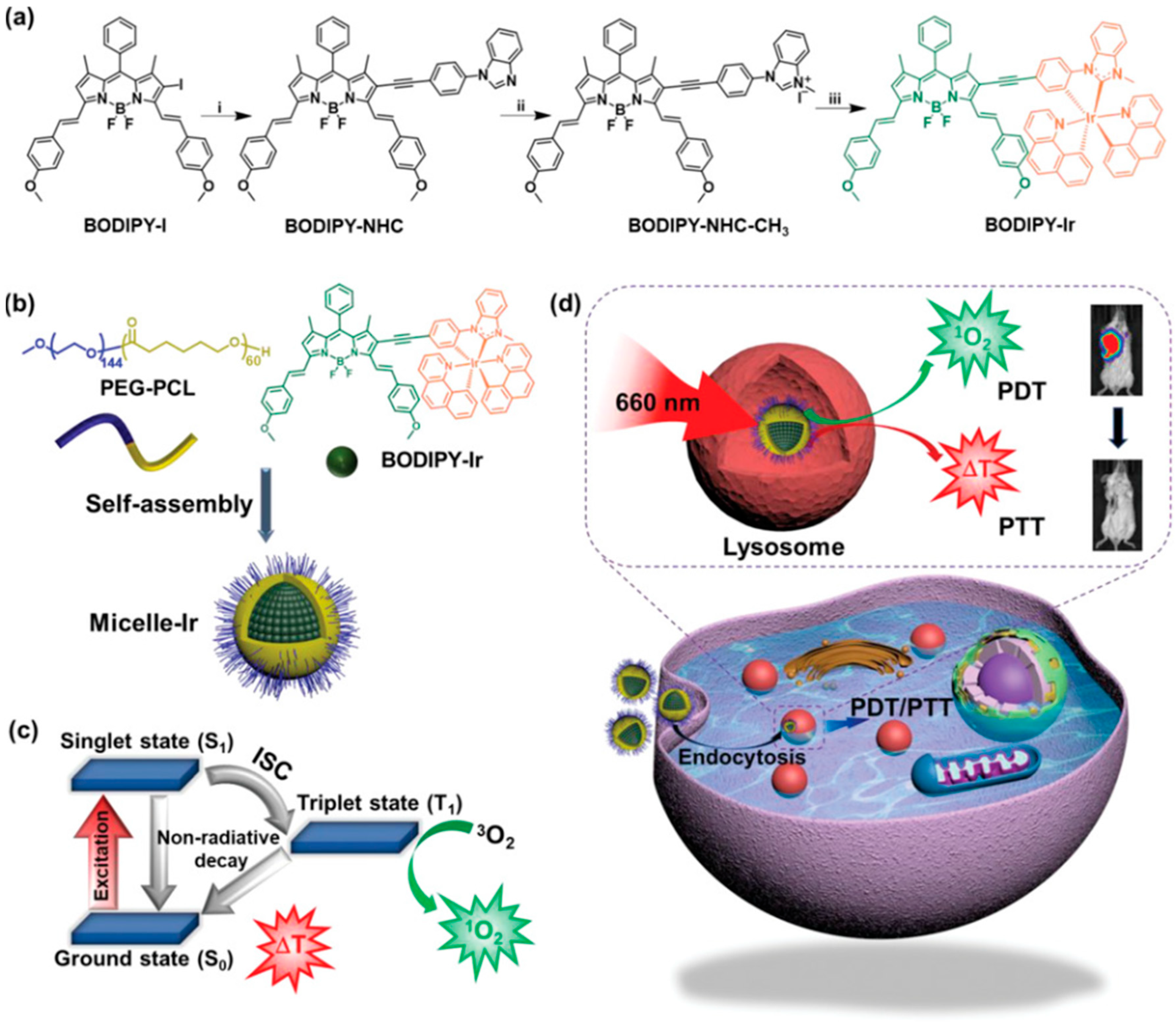 - Liu, B.; Jiao, J.; Xu, W.; Zhang, M.; Cui, P.; Guo, Z.; Deng, Y.; Chen, H.; Sun, W. Highly Efficient Far-Red/NIR-Absorbing Neutral Ir (III) Complex Micelles for Potent Photodynamic/Photothermal Therapy. Adv. Mater. 2021, 33, e2100795. [Google Scholar] [CrossRef]