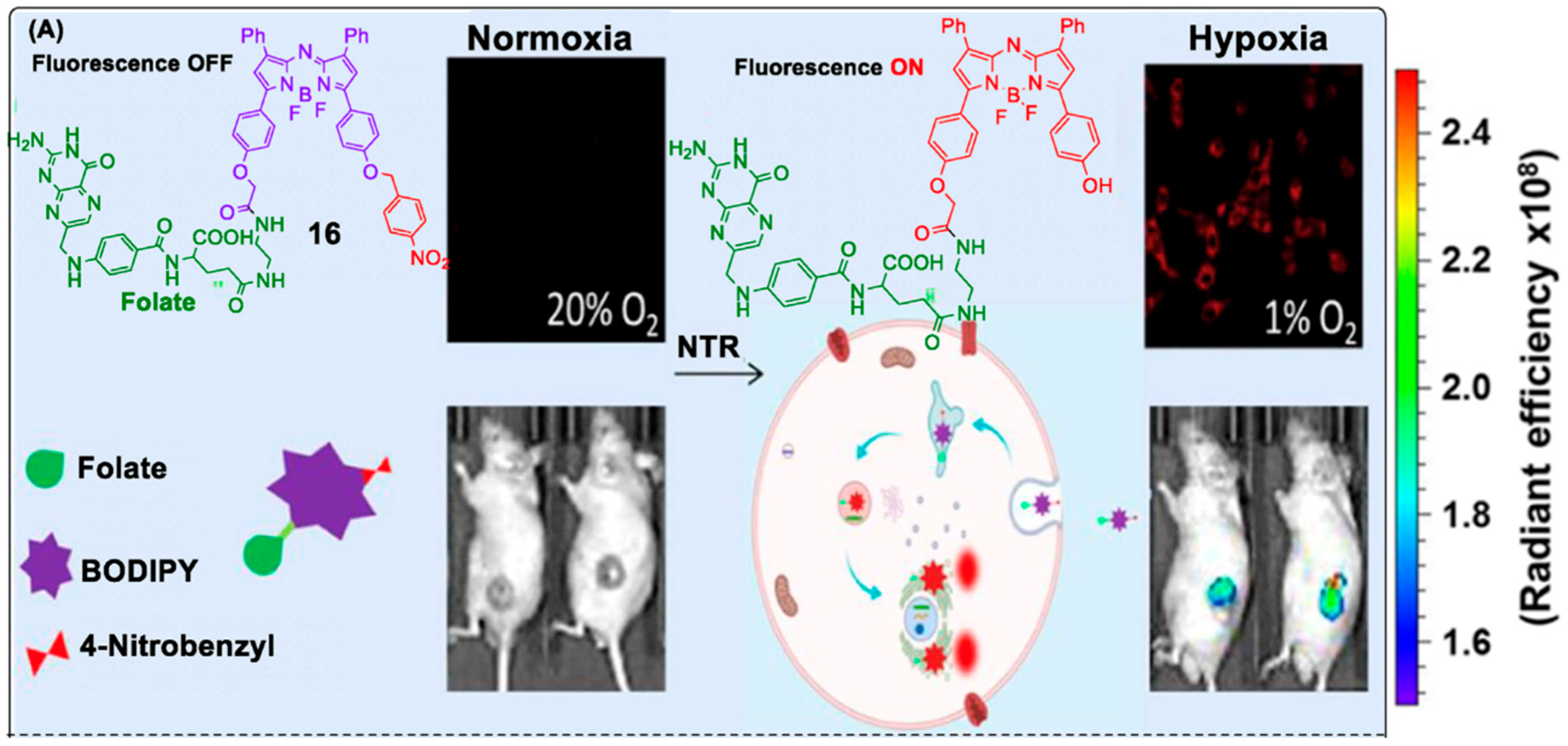 - Gai, L.; Liu, Y.; Zhou, Z.; Lu, H.; Guo, Z. BODIPY-based probes for hypoxic environments. Coord. Chem. Rev. 2023, 481, 215041. [Google Scholar] [CrossRef]