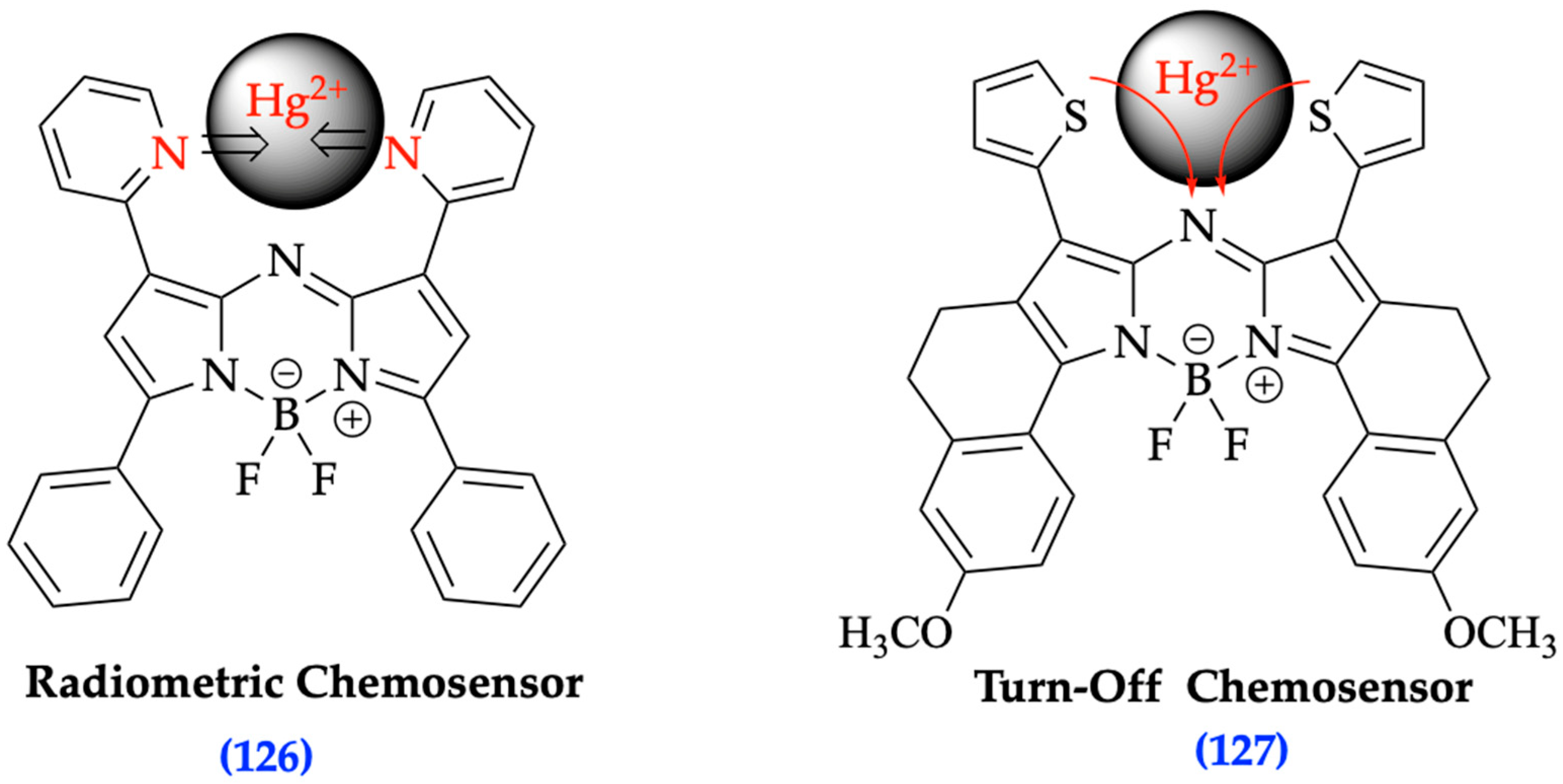 - Jiang, X.-D.; Zhao, J.; Li, Q.; Sun, C.-L.; Guan, J.; Sun, G.-T.; Xiao, L.-J. Synthesis of NIR fluorescent thienyl-containing aza-BODIPY and its application for detection of Hg2+: Electron transfer by bonding with Hg2+. Dye. Pigment. 2015, 125, 136–141. [Google Scholar] [CrossRef]